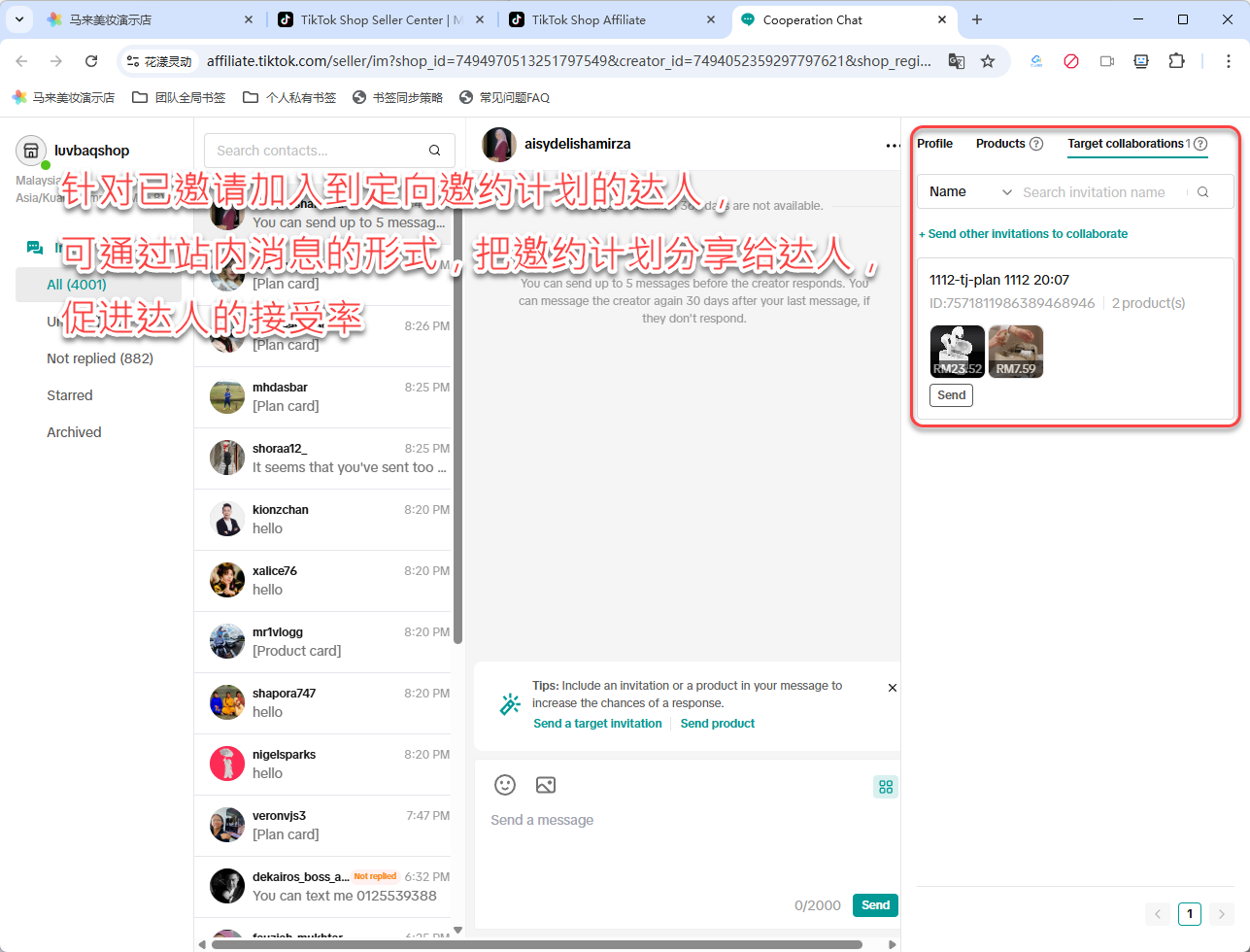 店铺后台在对达人发送站内消息时,新增了一个特性:如果该达人已经在某个定向邀约计划中,则允许将该邀约计划分享给达人,从而增加达人针对定向邀约计划的接受率:
