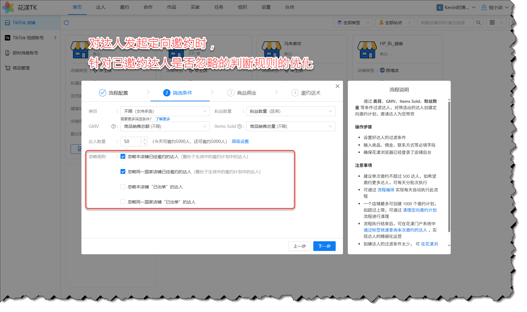 - 忽略本店铺已经邀约的达人:如果达人已经存在于本店铺已有的邀约计划中,则忽略此达人