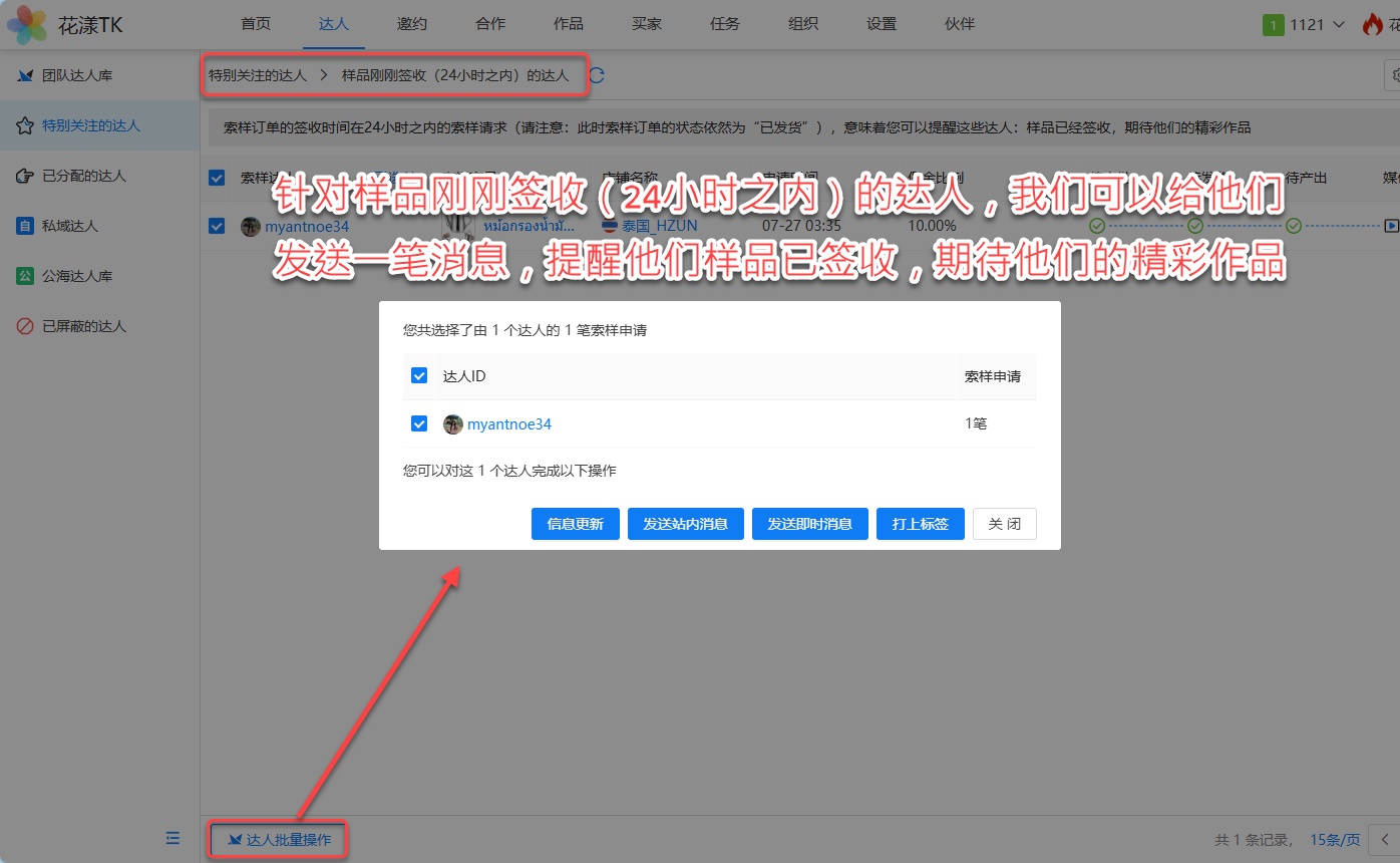 - 邀约计划分享:以站内消息的形式提醒达人接受邀约