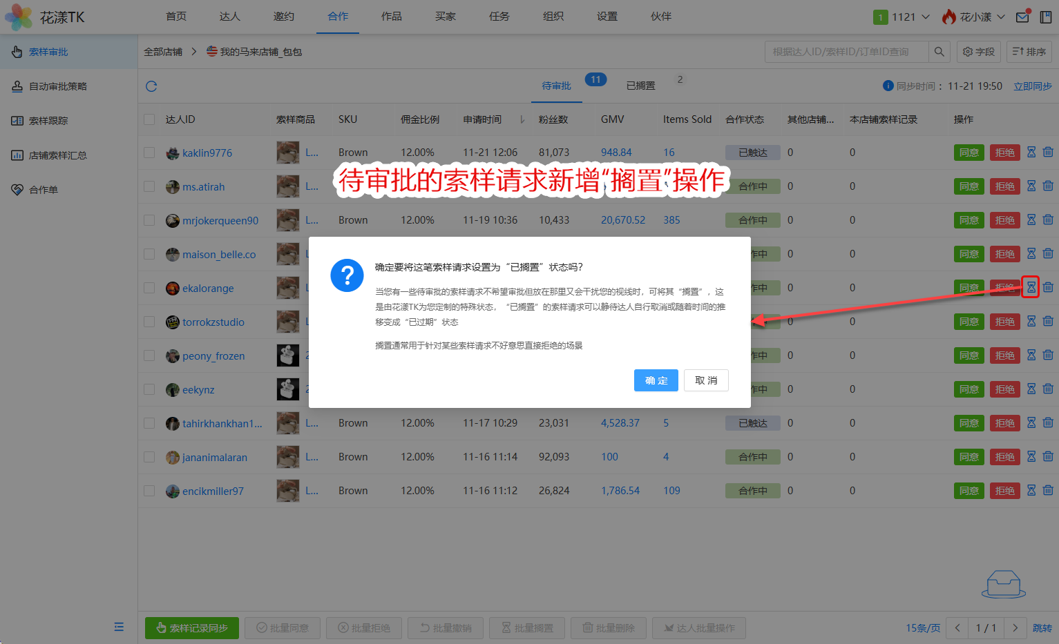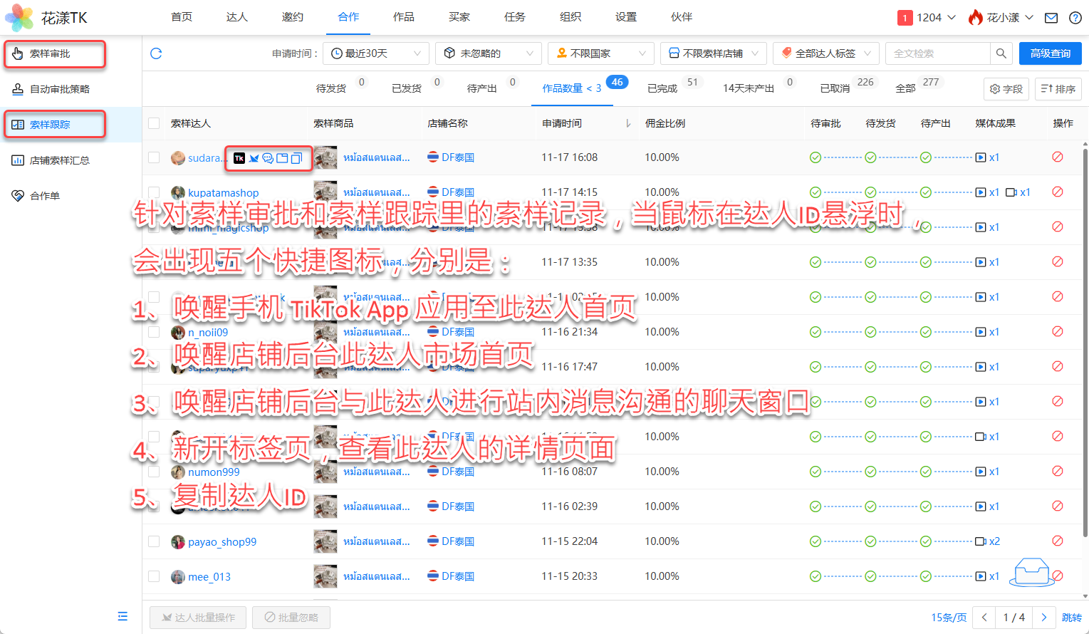 7、针对索样审批与索样跟踪,允许一键唤醒达人的市场首页以及与达人沟通的聊天窗口