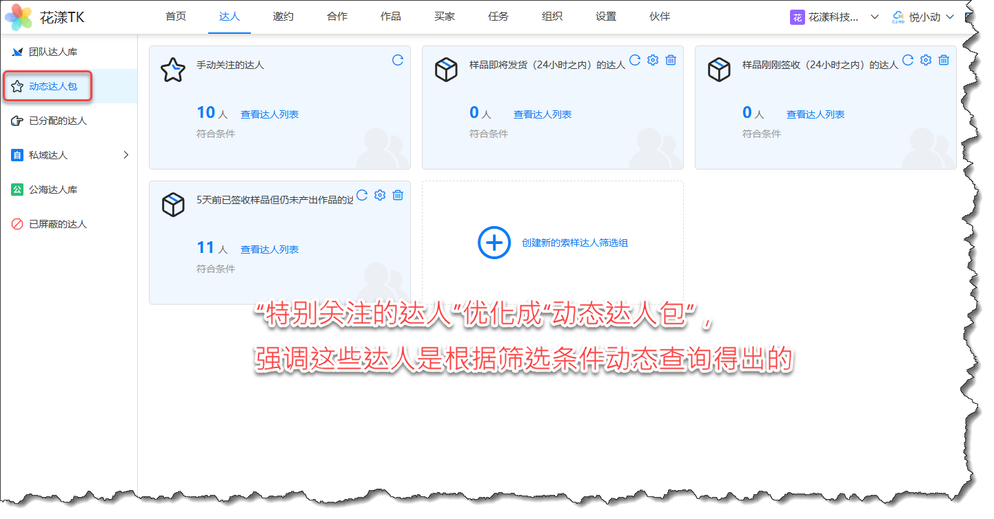- 达人精细运营版:该版本除拥有 “邀约建联版” 所有的功能外,还为用户提供了索样自动审批、达人作品管理、投流素材管理、以及流程自动化编排等模块,从功能特性上来说,该版本几乎涵盖了其它友商邀约建联软件的全部功能。