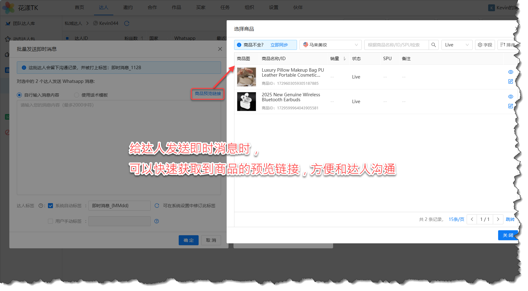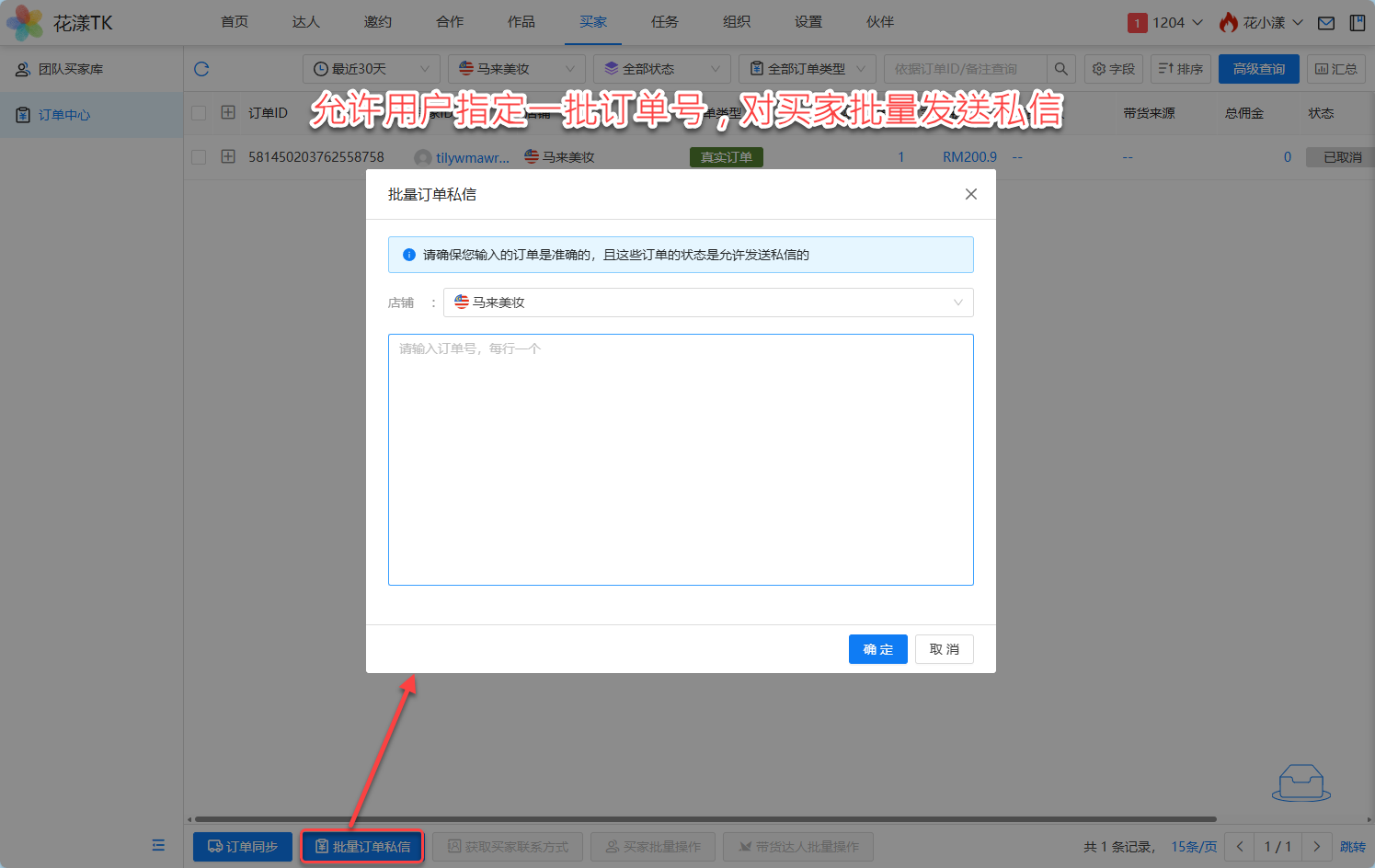 花漾TK很久之前便提供了“批量给买家发送店铺私信”,以及“批量选择订单通过订单给买家发送私信”的特性。但显然,在订单的查询方面,花漾TK提供的视角是有限的,很多卖家希望能够在ERP系统中查询出某些订单,如库存不足的订单,然后再对这些订单买家发送私信。新版本提供了允许用户根据订单列表给买家发送私信的能力: