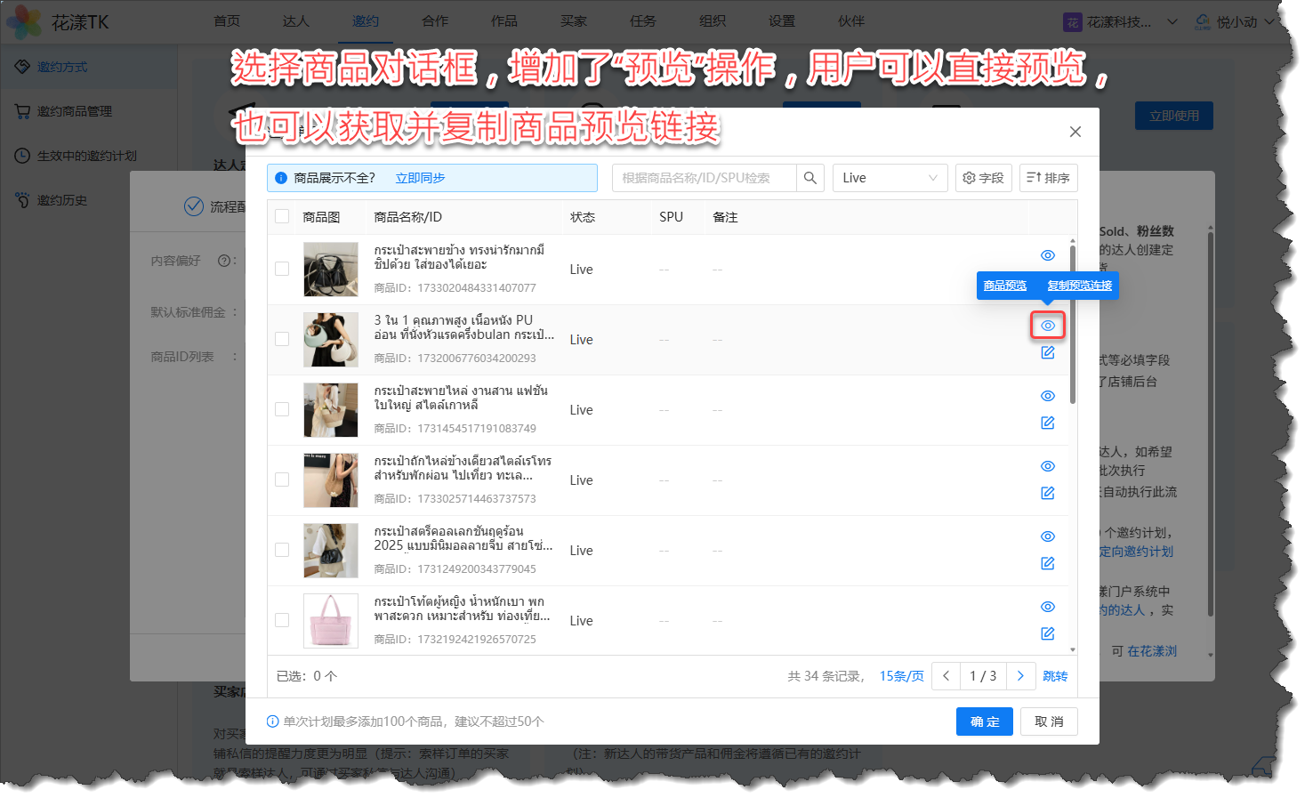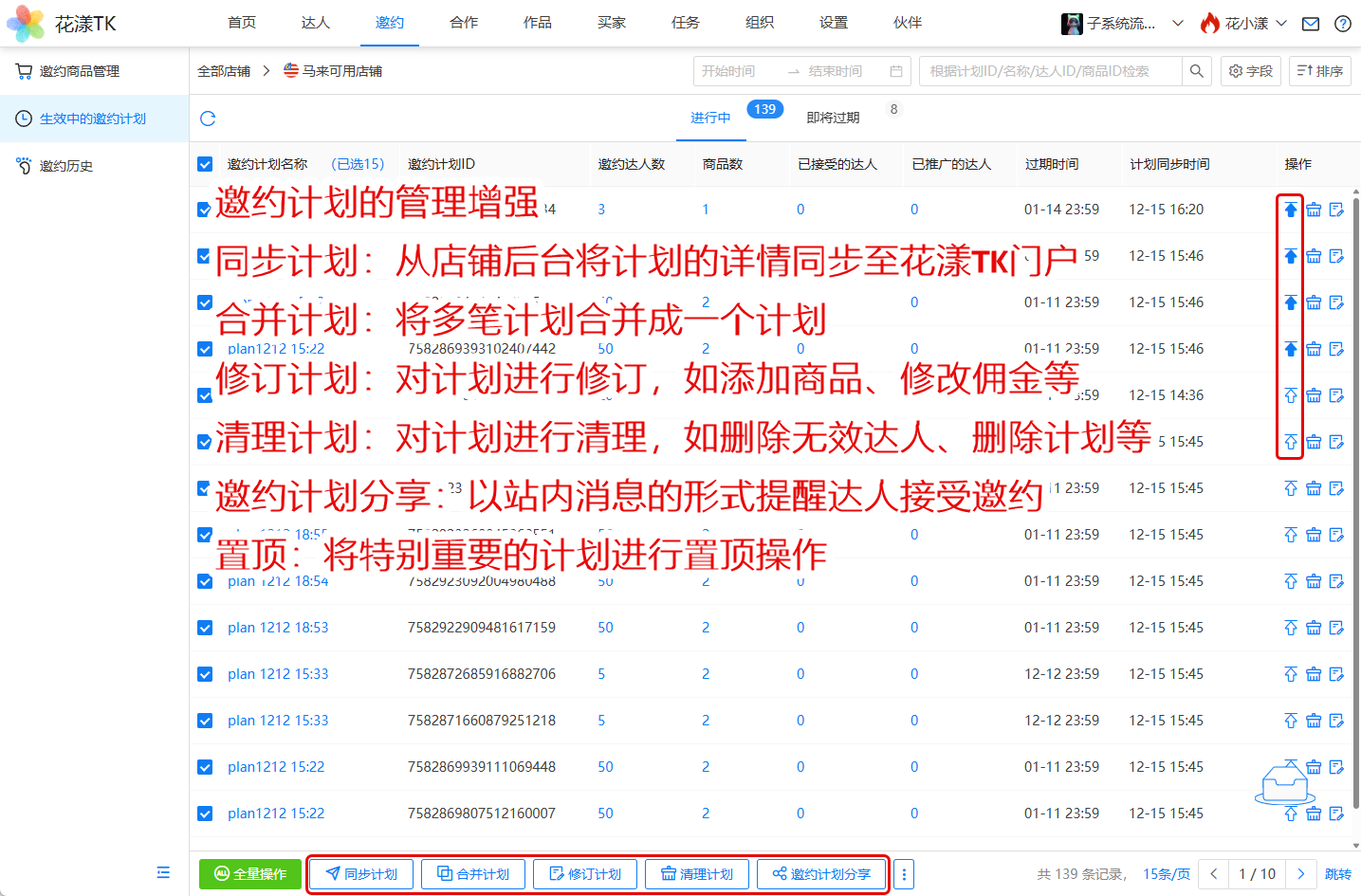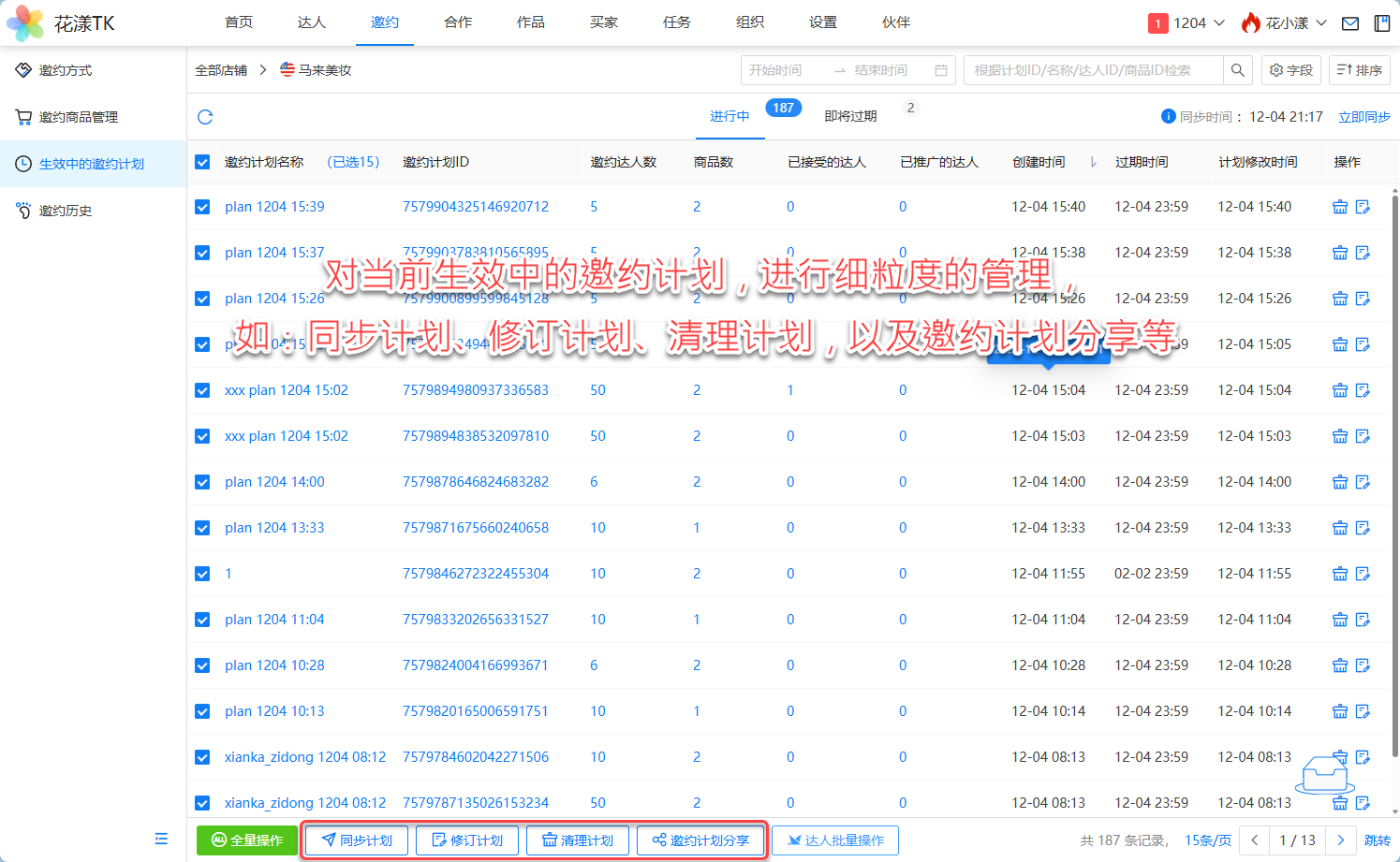 - 同步计划:从店铺后台将指定的邀约计划的详情同步至花漾TK门户