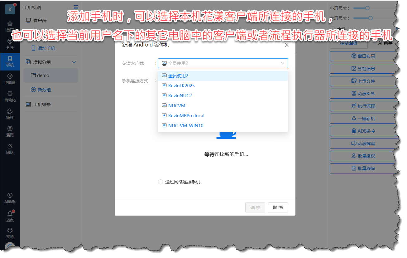 《添加手机时可以选择其它电脑中的客户端或流程执行器所连接的手机》