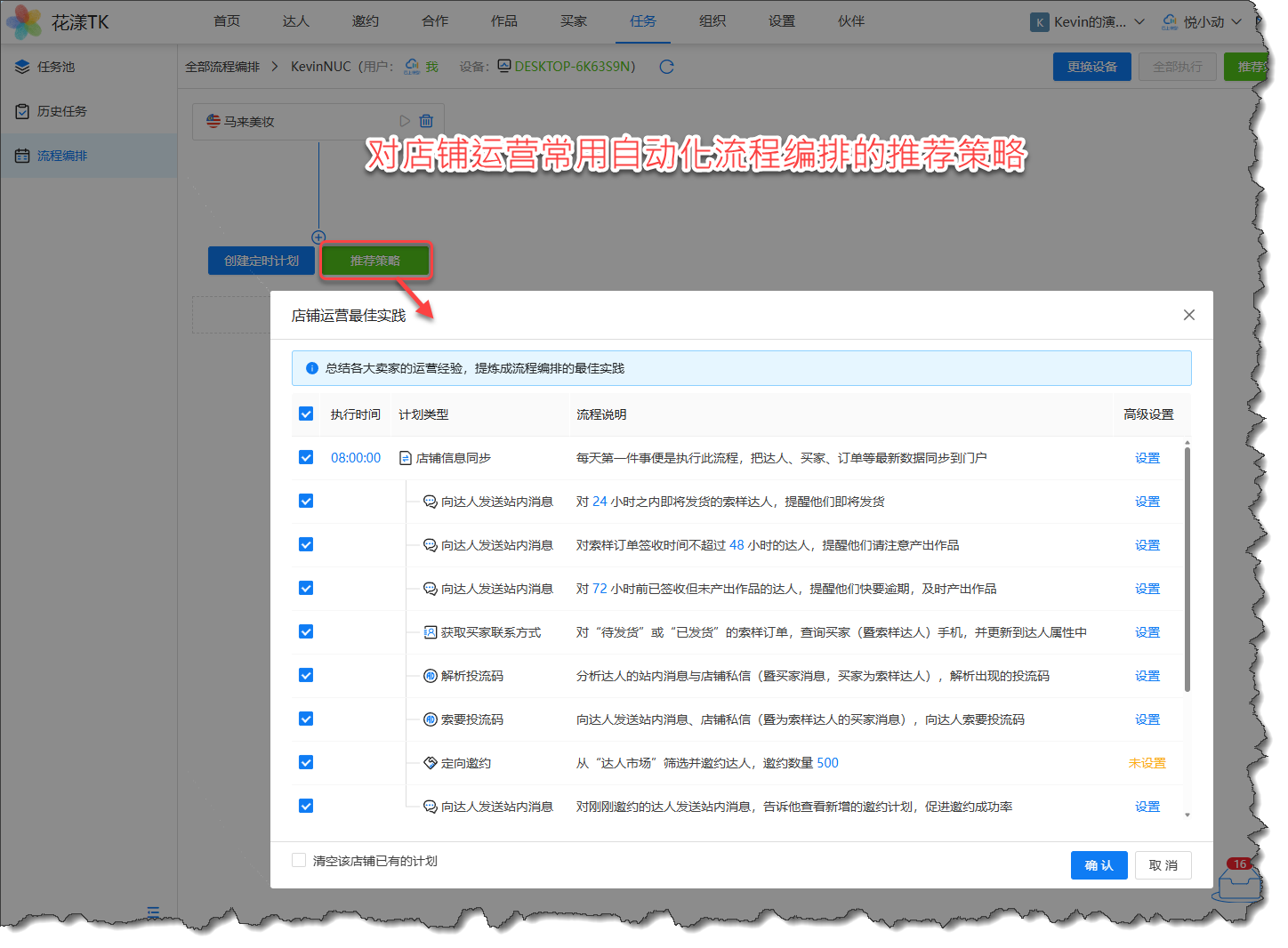 花漾TK很久之前的版本便提供了流程自动化编排的特性,但令人诟病的是,需要用户自行设置编排计划,这对新手用户来说非常困惑。新版本推出了针对流程编排方面的推荐策略,您只需在系统提供的策略模板上做一些微调,便可以编排出符合您要求的自动化流程计划: