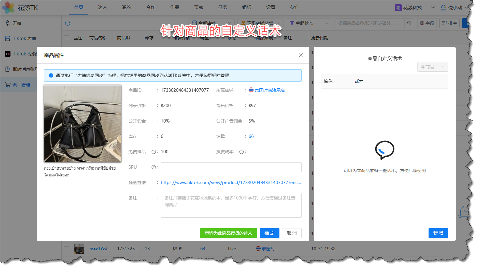 新版本能够对商品进行自定义话术的管理,方便用户在和达人沟通时,随时针对商品查找适合的话术:
