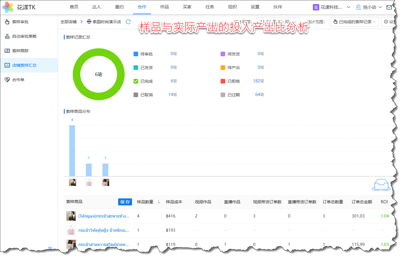 很多卖家在样品发送方面存在的困惑是:希望知道发出去的样品和样品产出的订单之间的投入产出比。举个例子:卖家发出去了10个样品,共产出了30个视频和6场直播,而这些视频和直播共产生了100笔订单,卖家希望知道这10个样品的投入产出比。新版本在“店铺索样汇总”做了增强,支持按照指定的时间范围,对样品的投入产出比进行统计: