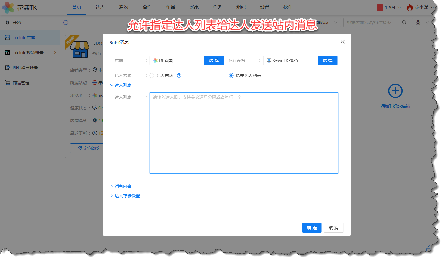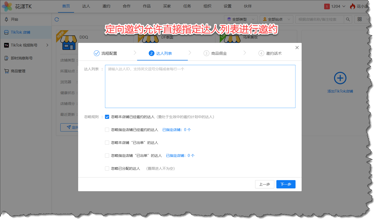 当通过店铺发起定向邀约时,允许用户直接录入达人的ID,并对这些达人进行定向邀约: