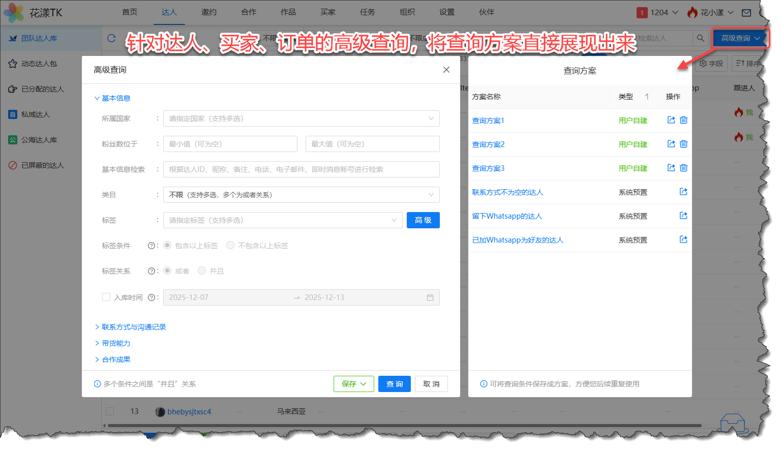 新版本针对达人、买家、和订单的高级查询做了优化,将查询方案直接展现出来,方便用户使用这些高级特性: