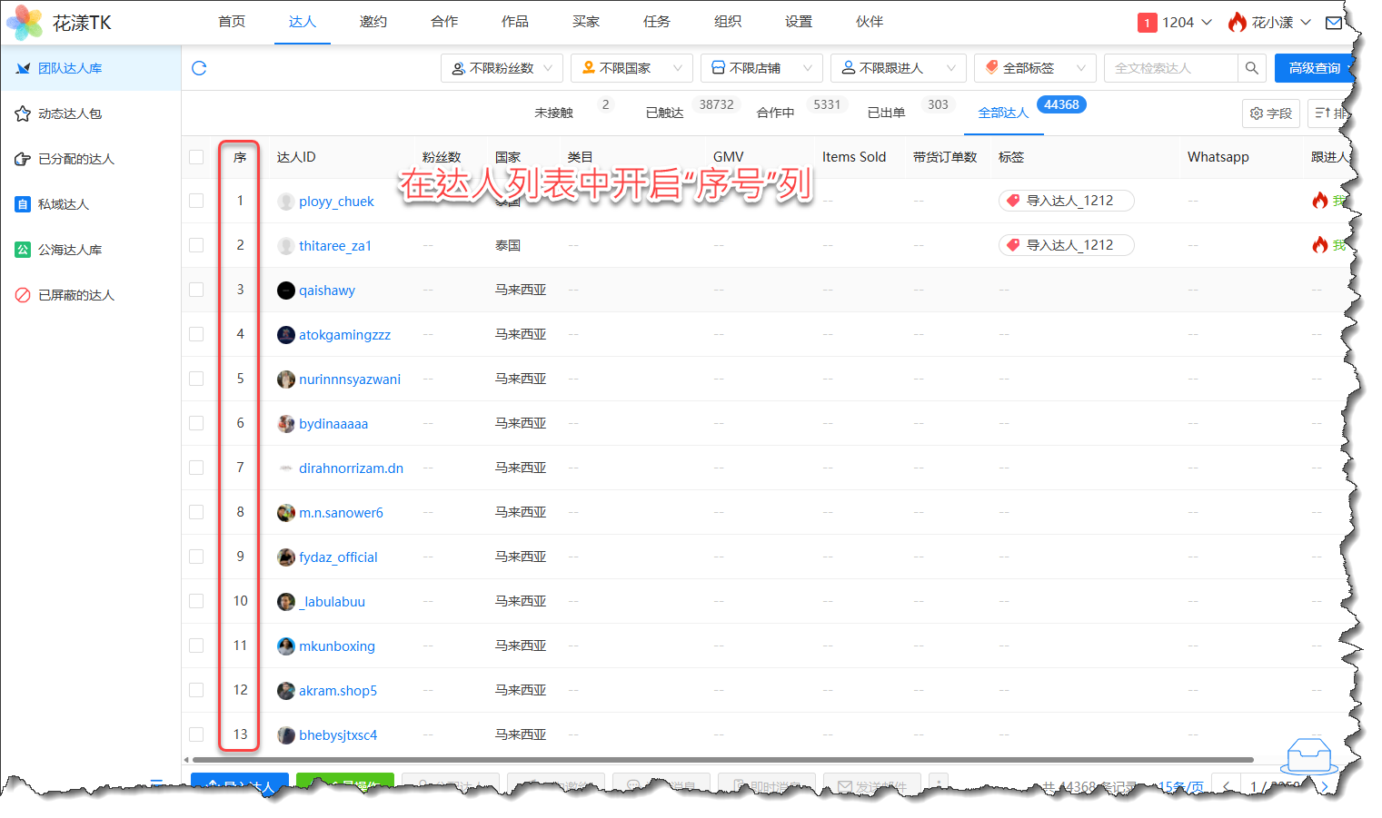 有些用户希望针对达人、索样、订单等列表,能够在前面展示“序号”,类似于Excel表格,新版本支持了此特性: