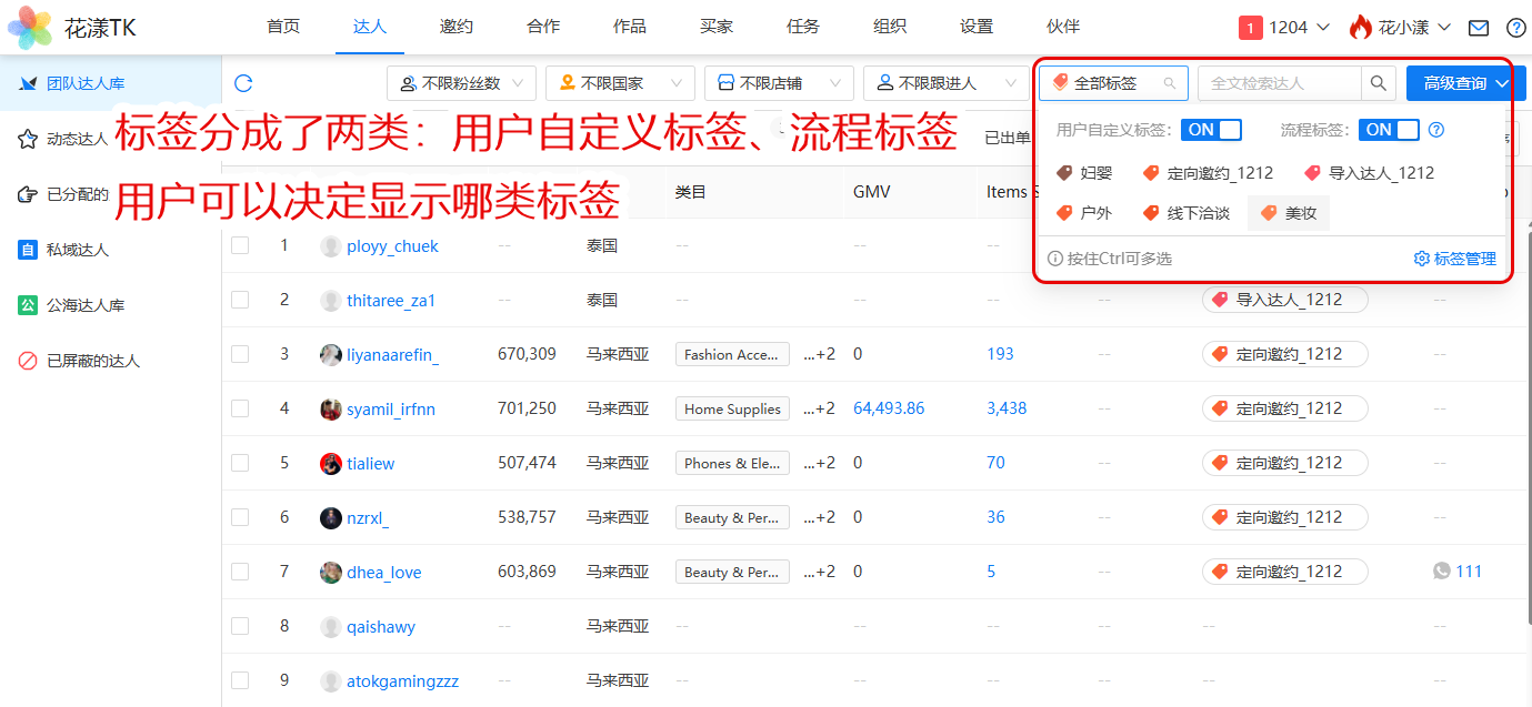 新版本将达人的标签分为两类,分别是:用户自定义标签、流程标签,当标签过多时,用户可以选择是否显示某一类标签: