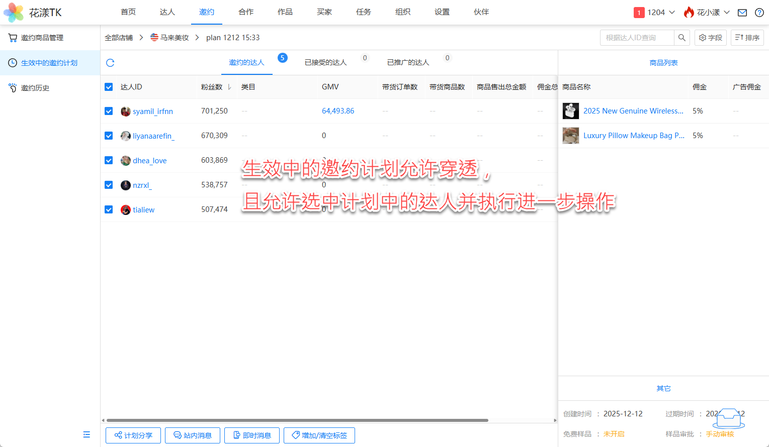 针对生效中的邀约计划,能够穿透至计划详情页面,并允许选中计划中的达人进行下一步操作: