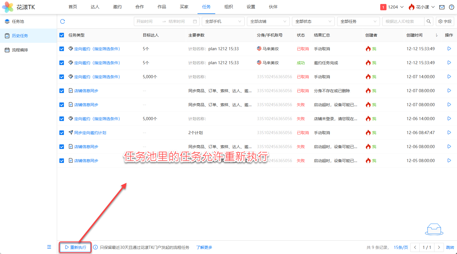 当在花漾TK门户中发起的流程任务遇到执行失败、无法正常启动等情况时,您可以在“历史任务”中重新执行这些任务: