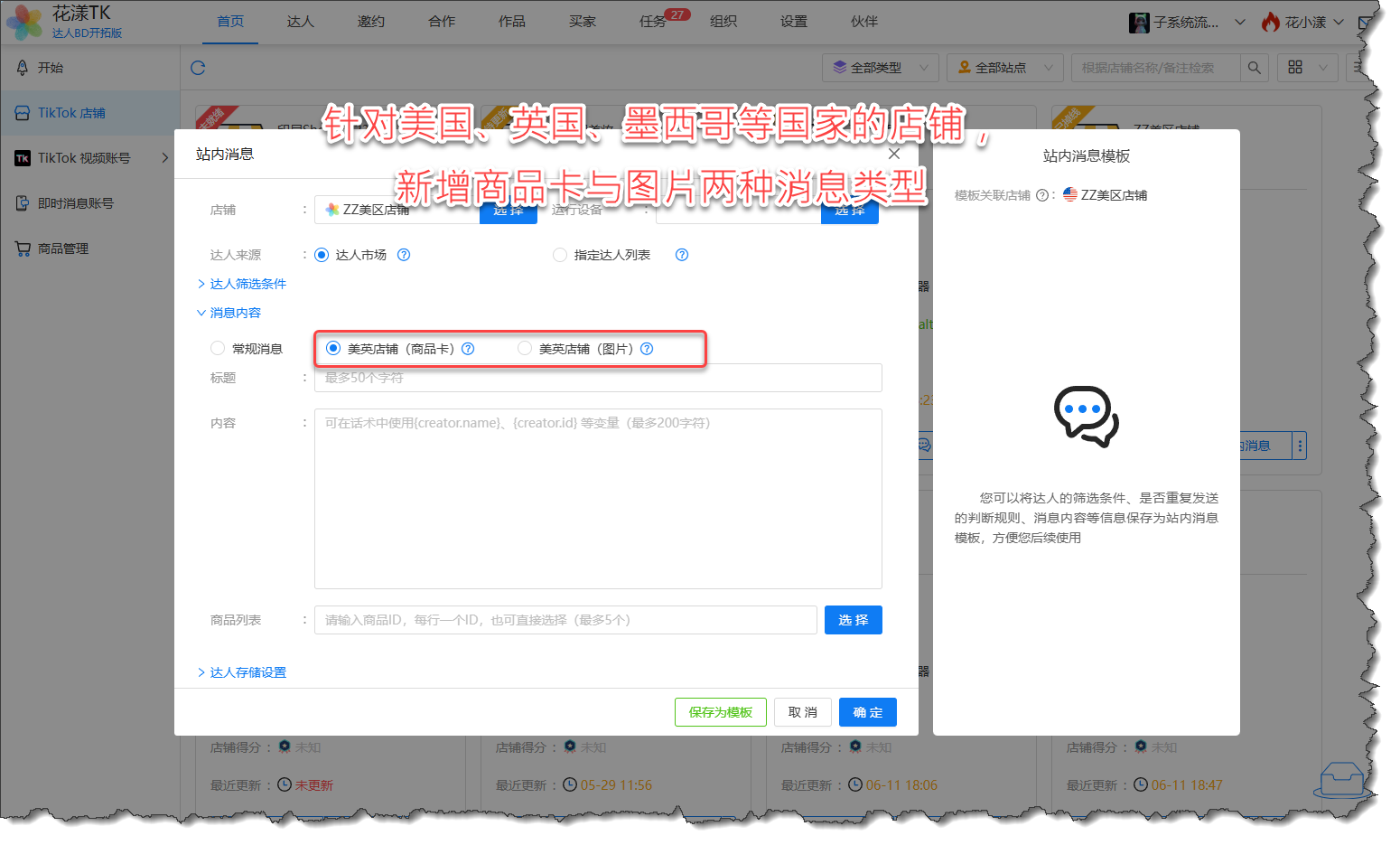 新版本针对达人定向邀约与站内消息支持“模板”操作,换言之,您可以将某个定向邀约计划或者某个达人站内消息保存为模板,方便您下次复用: