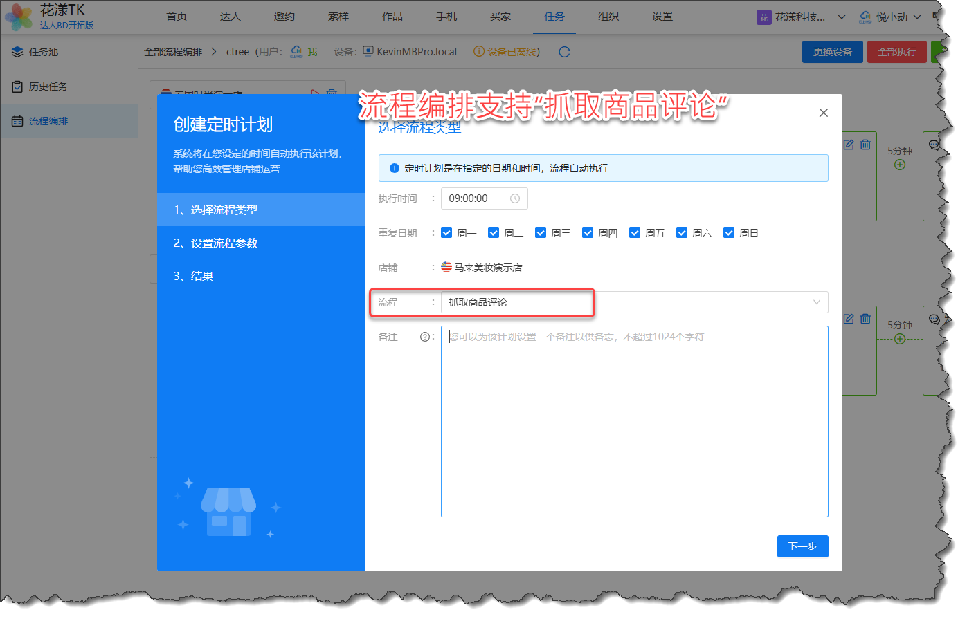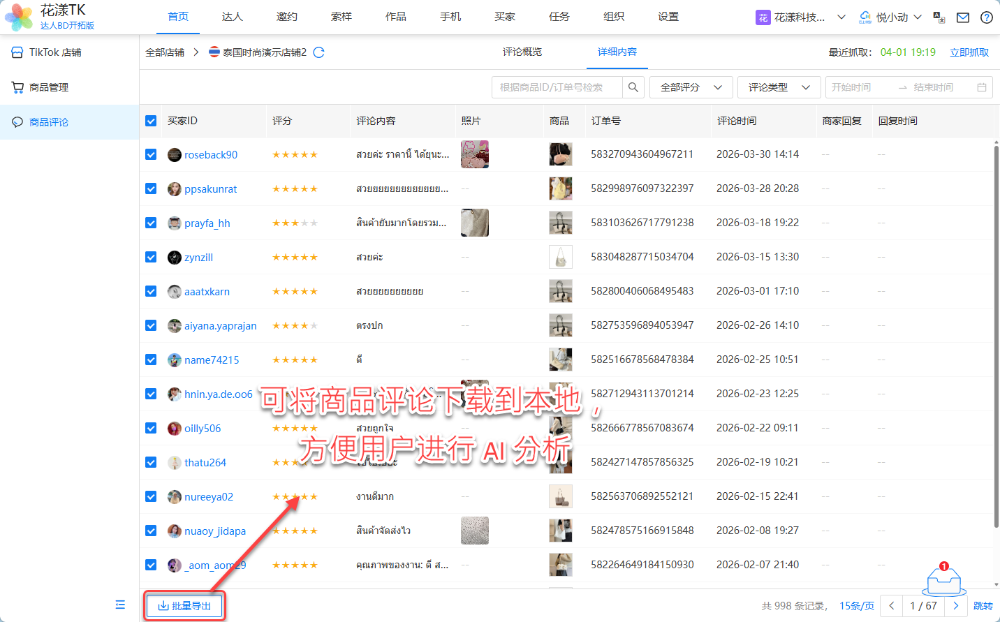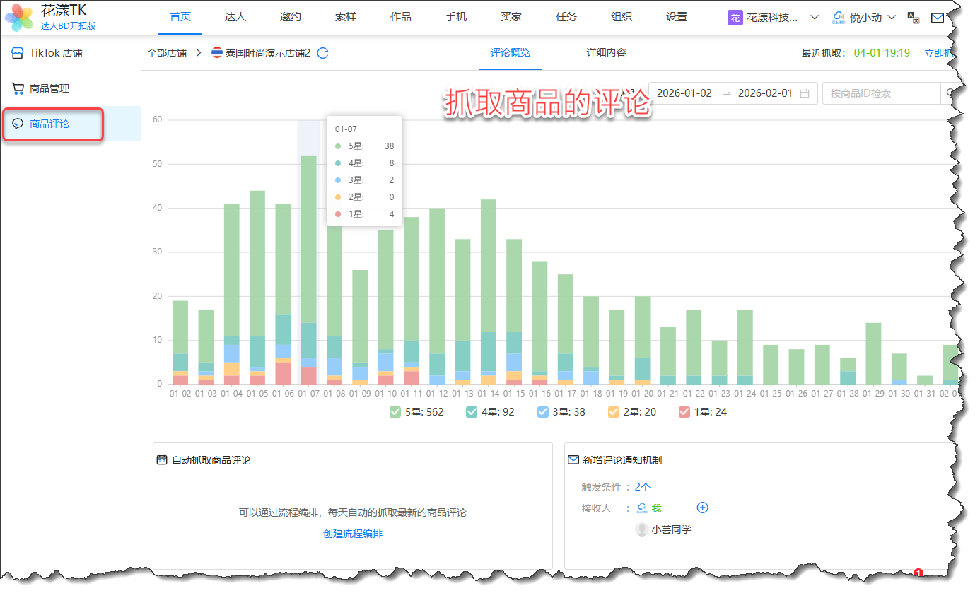 新版本上线了“抓取商品评论”流程,通过该流程能够将店铺中的商品评论抓取到花漾TK门户,方便用户分析使用: