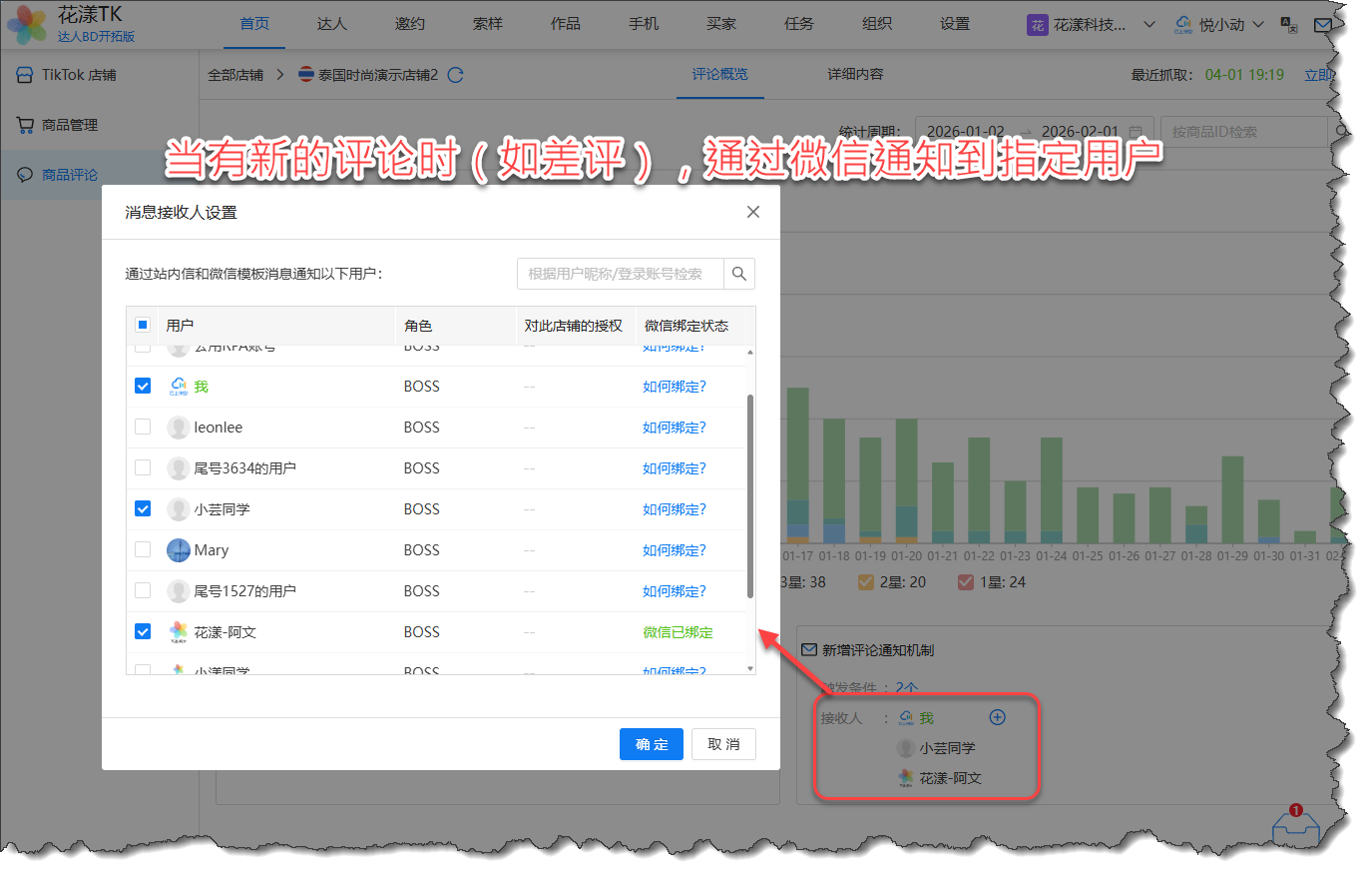 与此同时,当店铺增加了新的商品评论时,系统会自动通过站内消息和微信消息通知到指定用户,适用于当商品有差评时的及时处理: