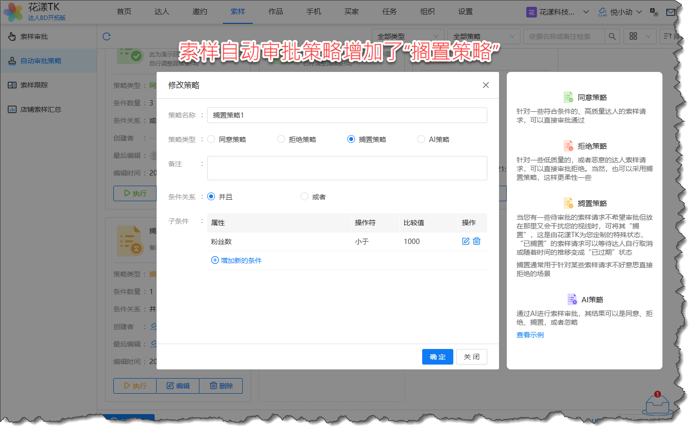 索样请求的自动审批策略以往只有 “同意策略” 与 “拒绝策略” 两种类型,事实上,大部分用户不会显式的拒绝达人的索样请求,更愿意采用 “搁置策略”,暨将达人的索样请求置为“搁置”状态,在不干扰用户视线的情况下静待索样请求过期或者索样达人主动取消;基于此,新版本上线了“搁置策略”: