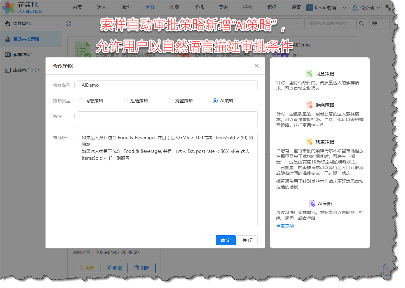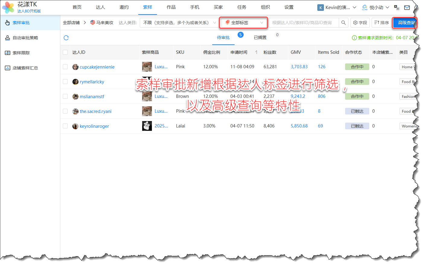针对待审批的索样请求,新版本支持按照达人的标签进行过滤,以及高级查询等特性: