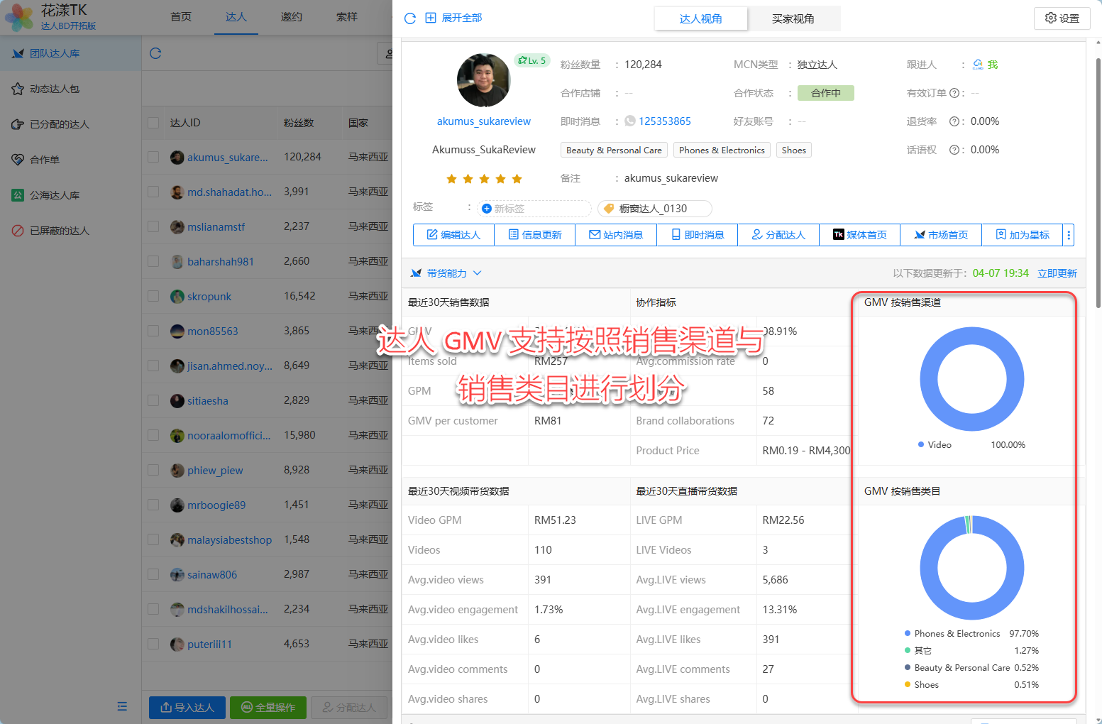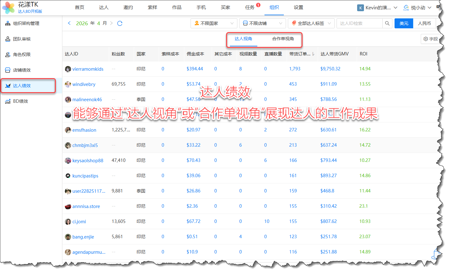 达人绩效是指:能够以“达人视角”或者“合作单视角”查看达人在每个自然月的工作成果,如索样成本、佣金成本、发布的视频与直播数量、带货订单数、GMV,以及 ROI 等数据: