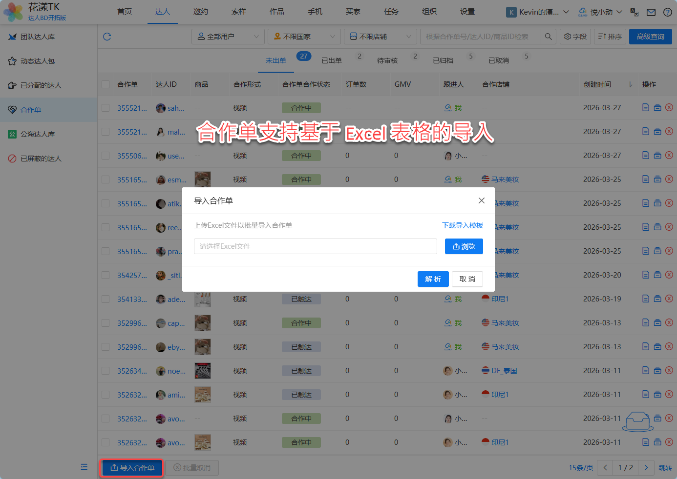 合作单支持基于 Excel 文件的导入,方便用户对合作单进行初始化操作: