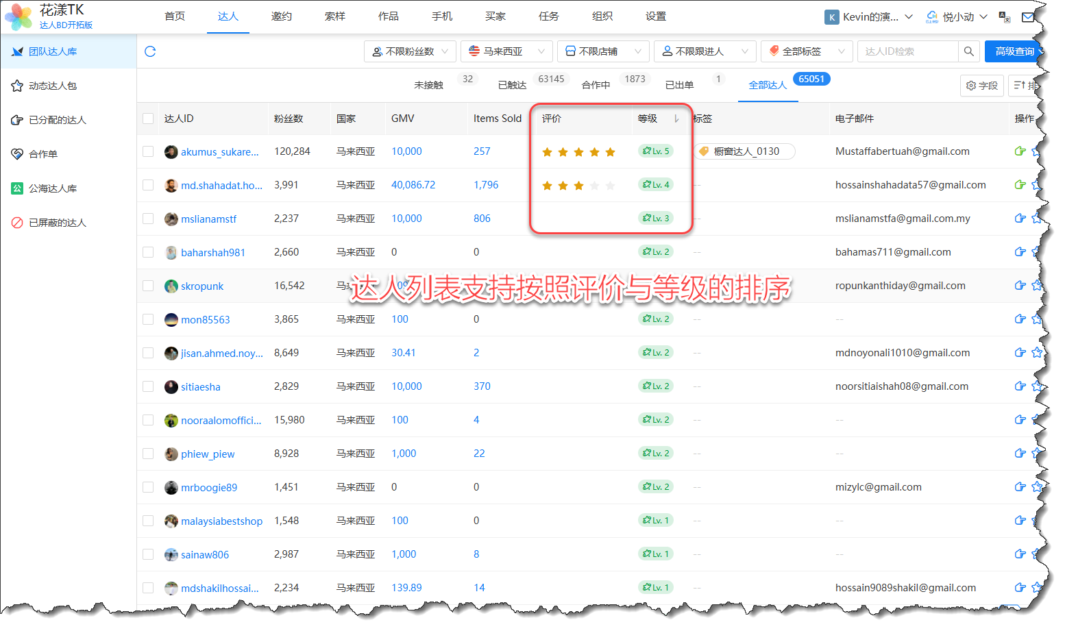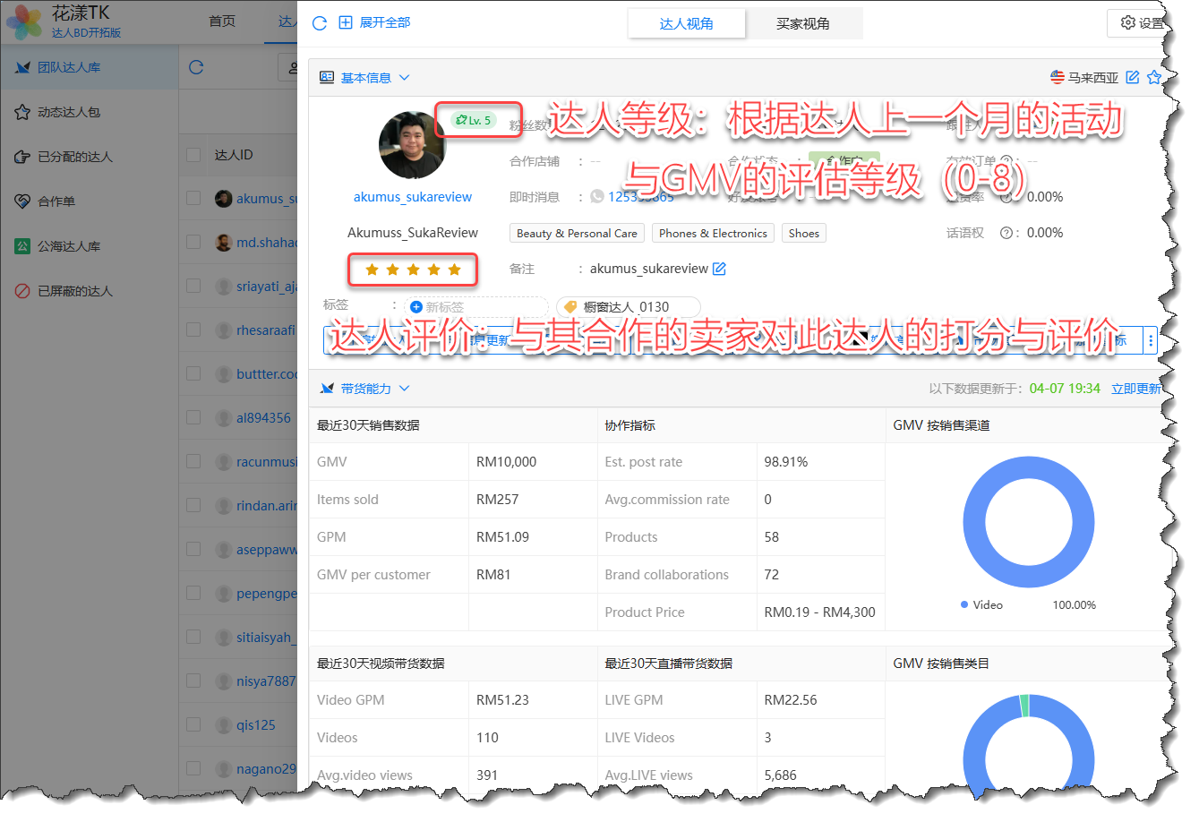 - 等级:根据达人上一个月的活动与GMV的评估等级(0-8级)