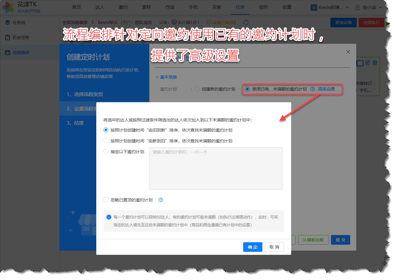 在流程编排中创建定向邀约计划时,如果选择的是“使用已有、未满额的邀约计划”时,可以通过“高级设置”指定是否“忽略已置顶的邀约计划”等条件: