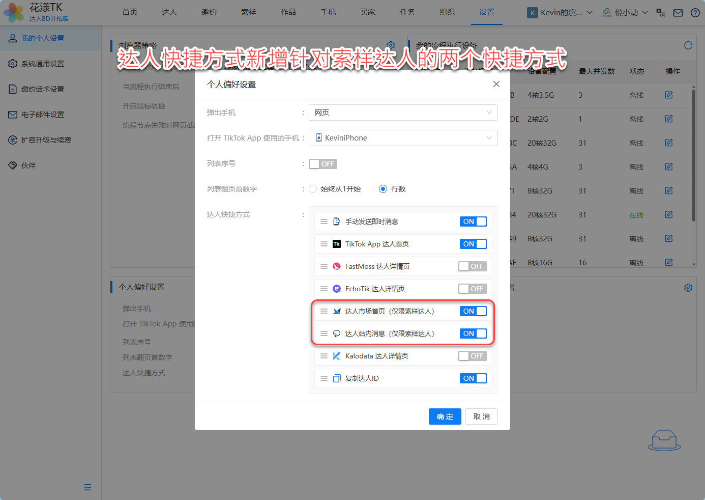 花漾TK有一个特性,当鼠标悬浮在达人ID上时,会出现一系列快捷方式,如:打开达人的 Tiktok App首页,复制达人的ID等;新版本针对索样达人,修复了一键打开“达人市场首页”和“达人站内消息”两个快捷方式: