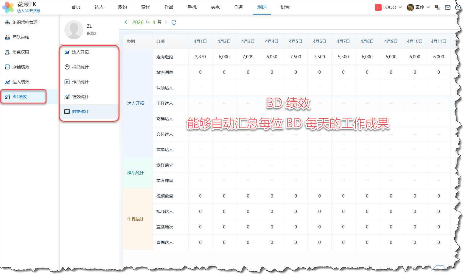 BD 绩效是指:能够以自然月为单位,自动汇总每位 BD 在指定时间周期内的工作成果,如达人开拓(包括邀约、寄样、履约等)、负责的样品、负责的达人作品、负责的达人绩效等: