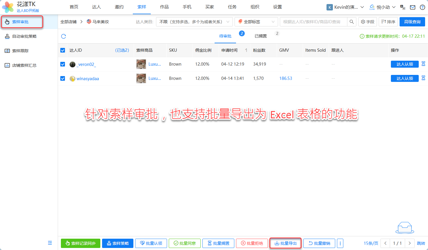 新版本针对索样审批做了优化,除了界面的调整外,还允许用户将待审批的索样记录导出为 Excel 表格,以及对“已搁置”的索样请求进行索样达人的批量操作: