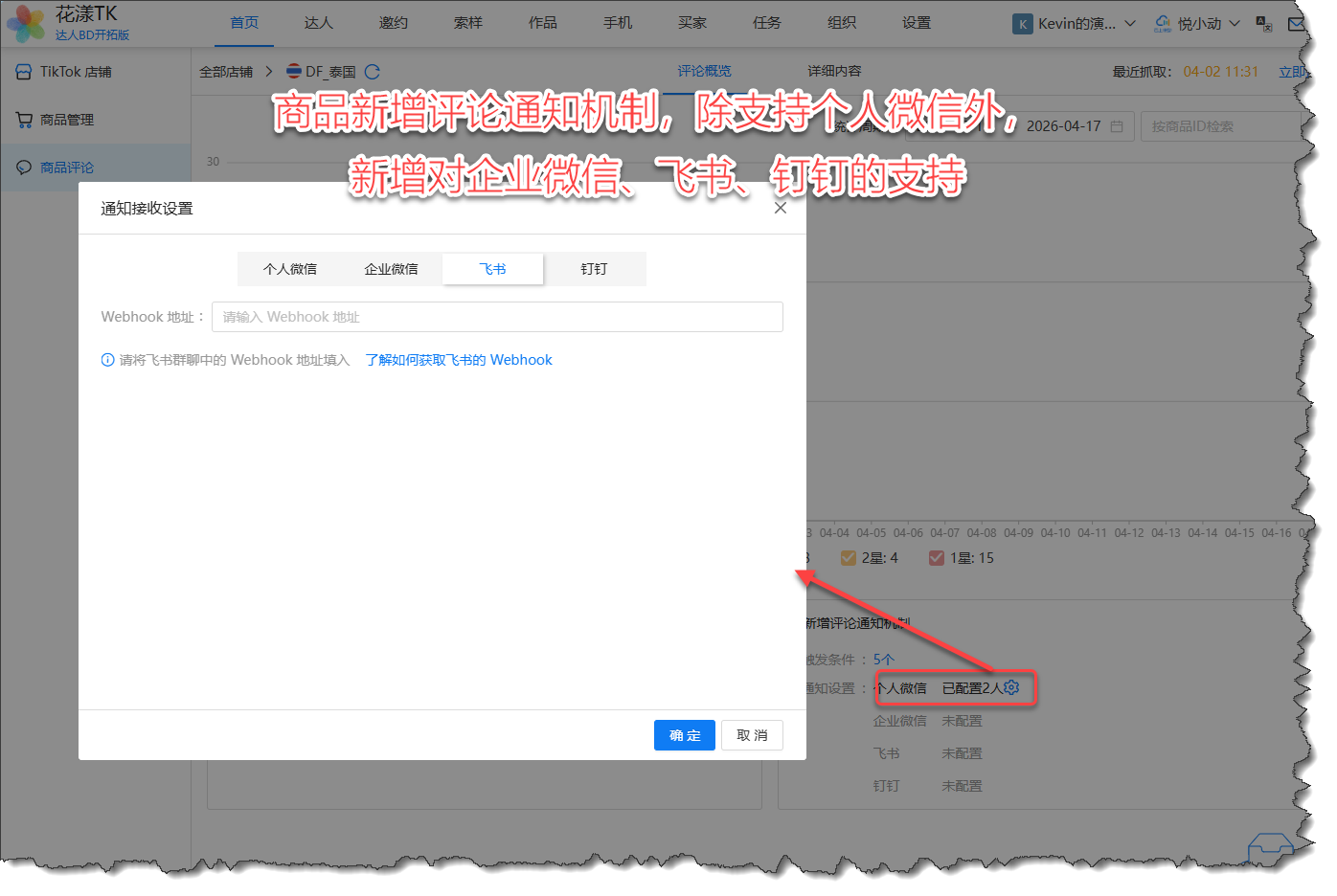 《商品评论通知机制新增对企业微信、飞书、钉钉的支持》