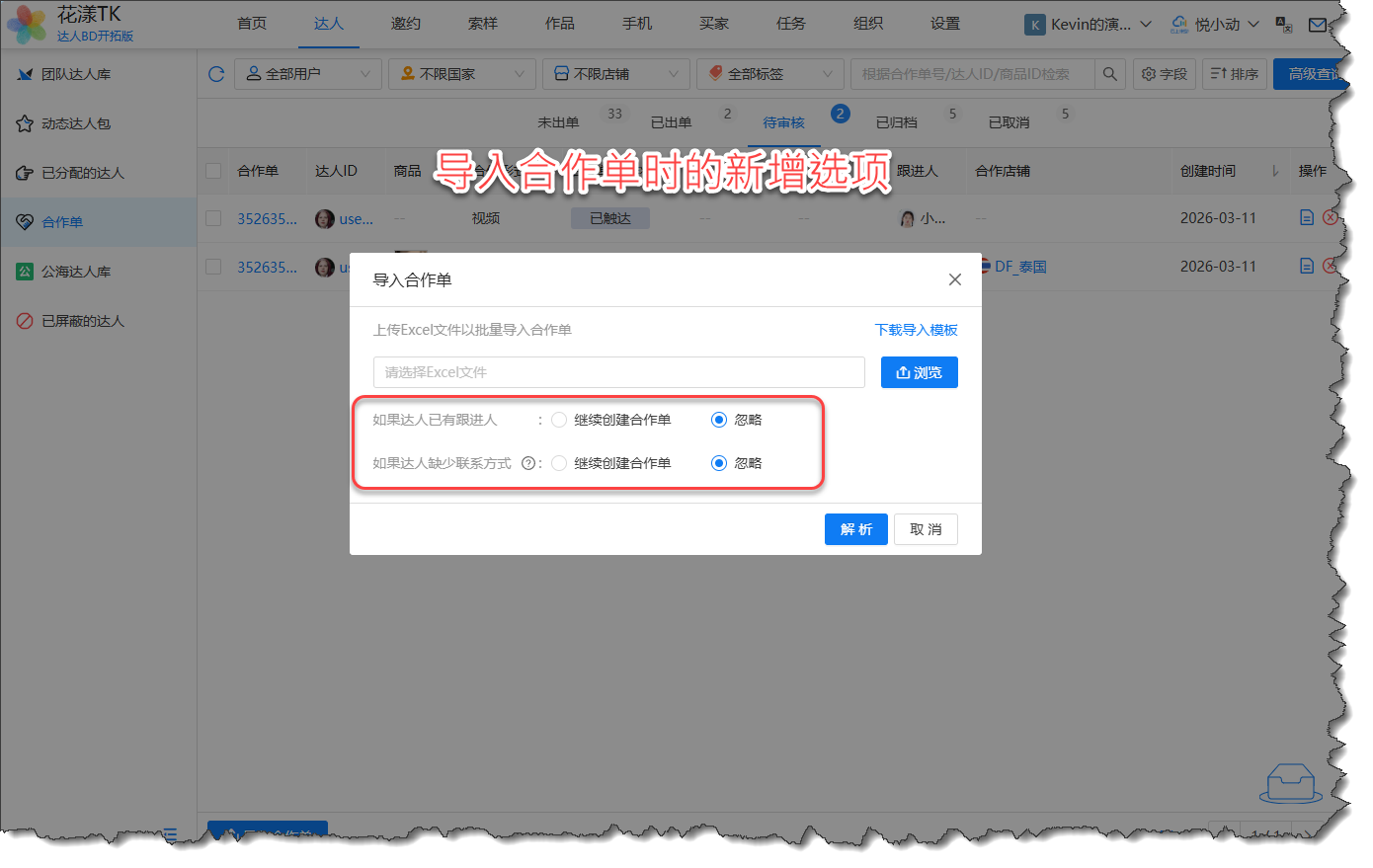新版本允许用户在导入合作单时,针对达人是否已有跟进人以及达人是否缺少联系方式等选项,决定是否继续创建合作单: