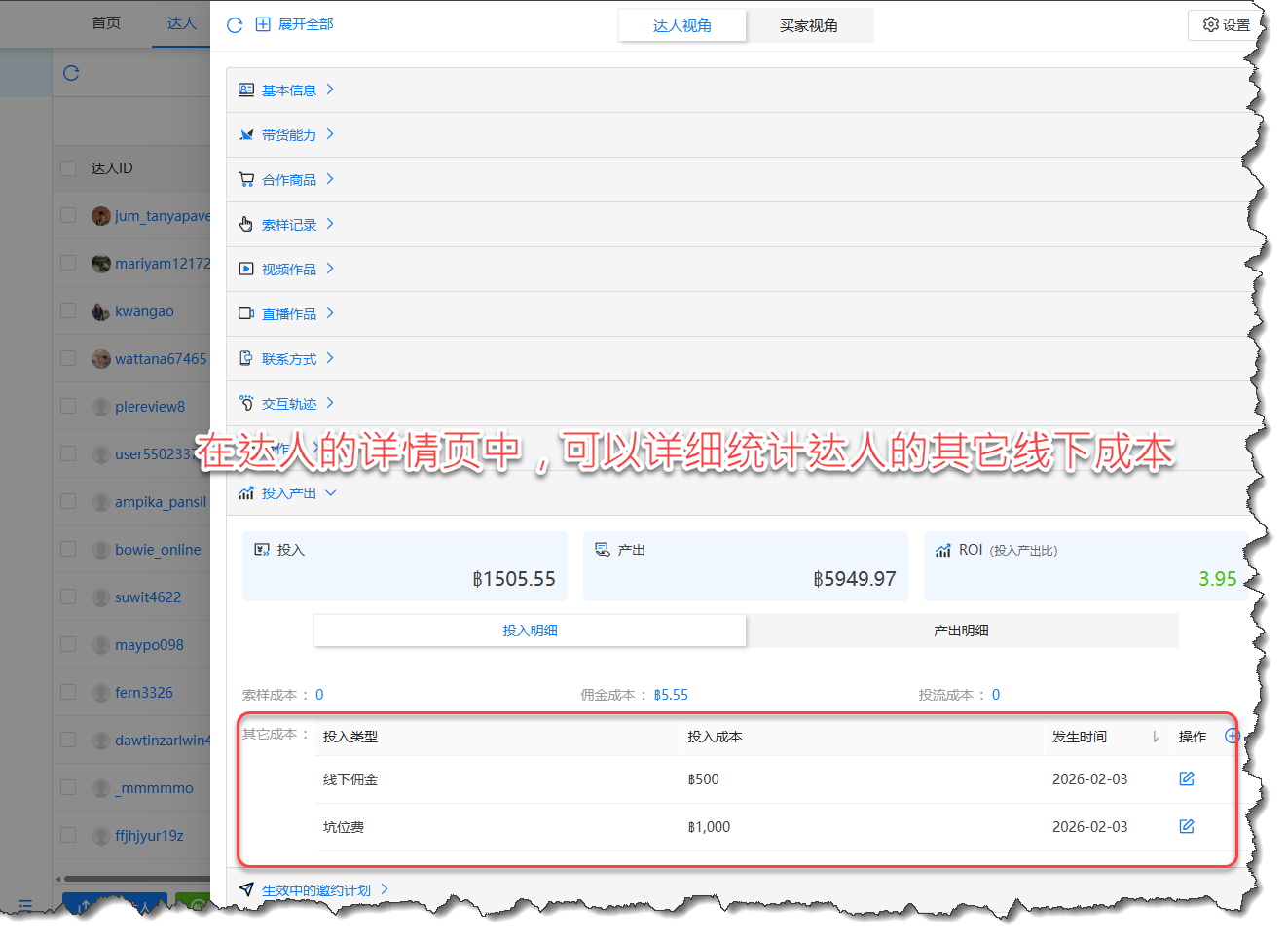 - 达人的投入分别是:达人的佣金、达人的样品成本、达人的其它线下成本(注一:达人的线下成本请参考下图)
