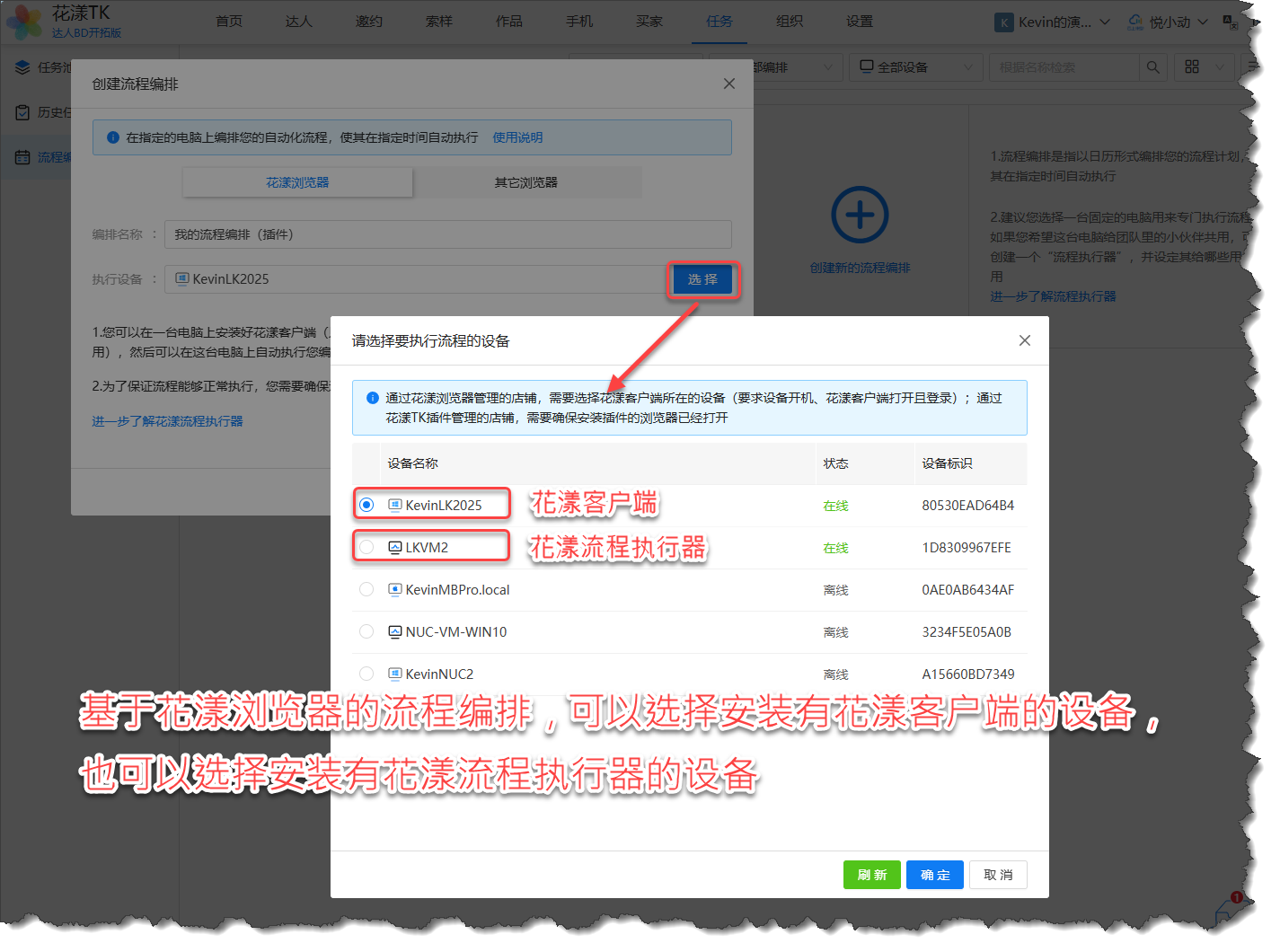 当创建“基于花漾浏览器的流程编排”时,需要选择一台设备,这台设备可以是安装了花漾客户端,也可以是花漾流程执行器,如下图所示: