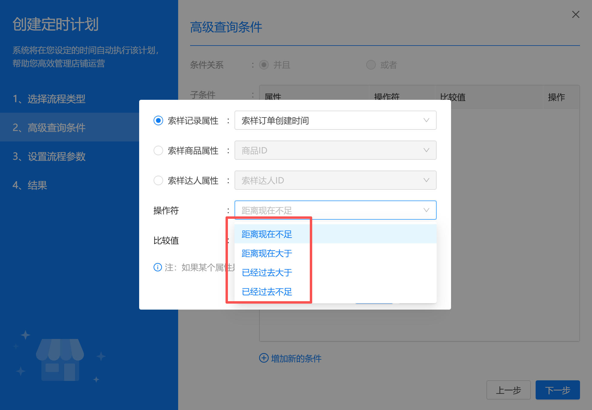 在流程编排中,达人来源是 索样达人 的高级查询条件中有“距离现在不足”、“距离现在大于”、“已经过去大于”、“已经过去不足”四个操作符: