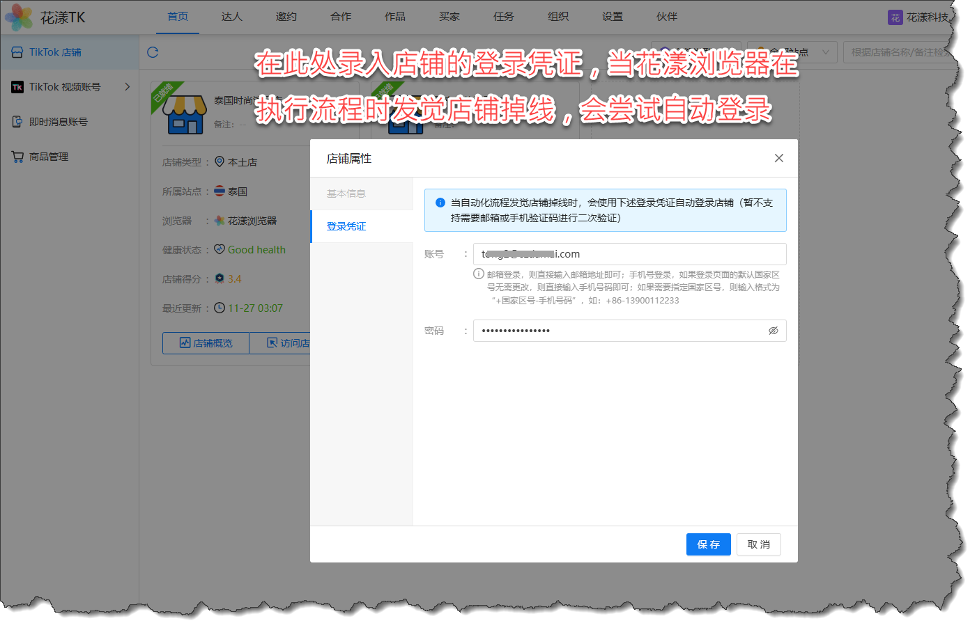 使用花漾浏览器来运营您的店铺时,如果在执行自动化流程时,发觉店铺掉线,花漾浏览器支持自动登录。您需要在店铺属性中,开启此特性: