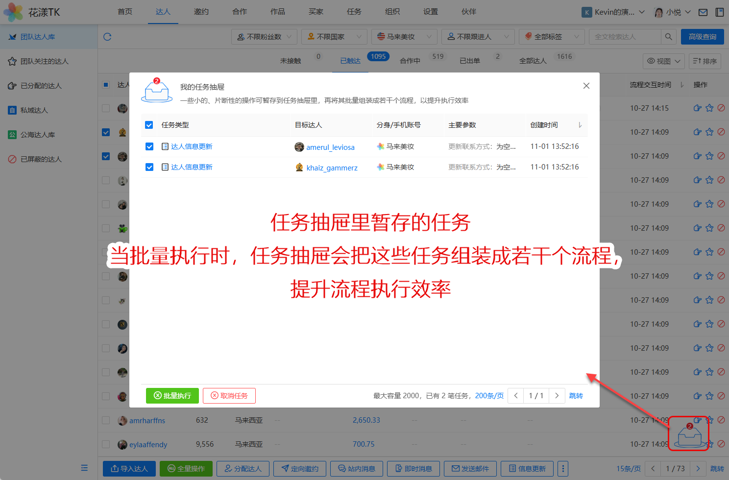 任务抽屉是指:我们可以把一些小的、片断性的流程任务暂存起来,再将其批量组装成若干个流程批量执行,以提升效率。以达人信息更新为例,如果我们启动一个流程只是为了更新某个达人的信息显然有些浪费,那么不妨把若干个达人的信息更新任务暂存到任务抽屉里,等存够一定数量时,再批量执行。