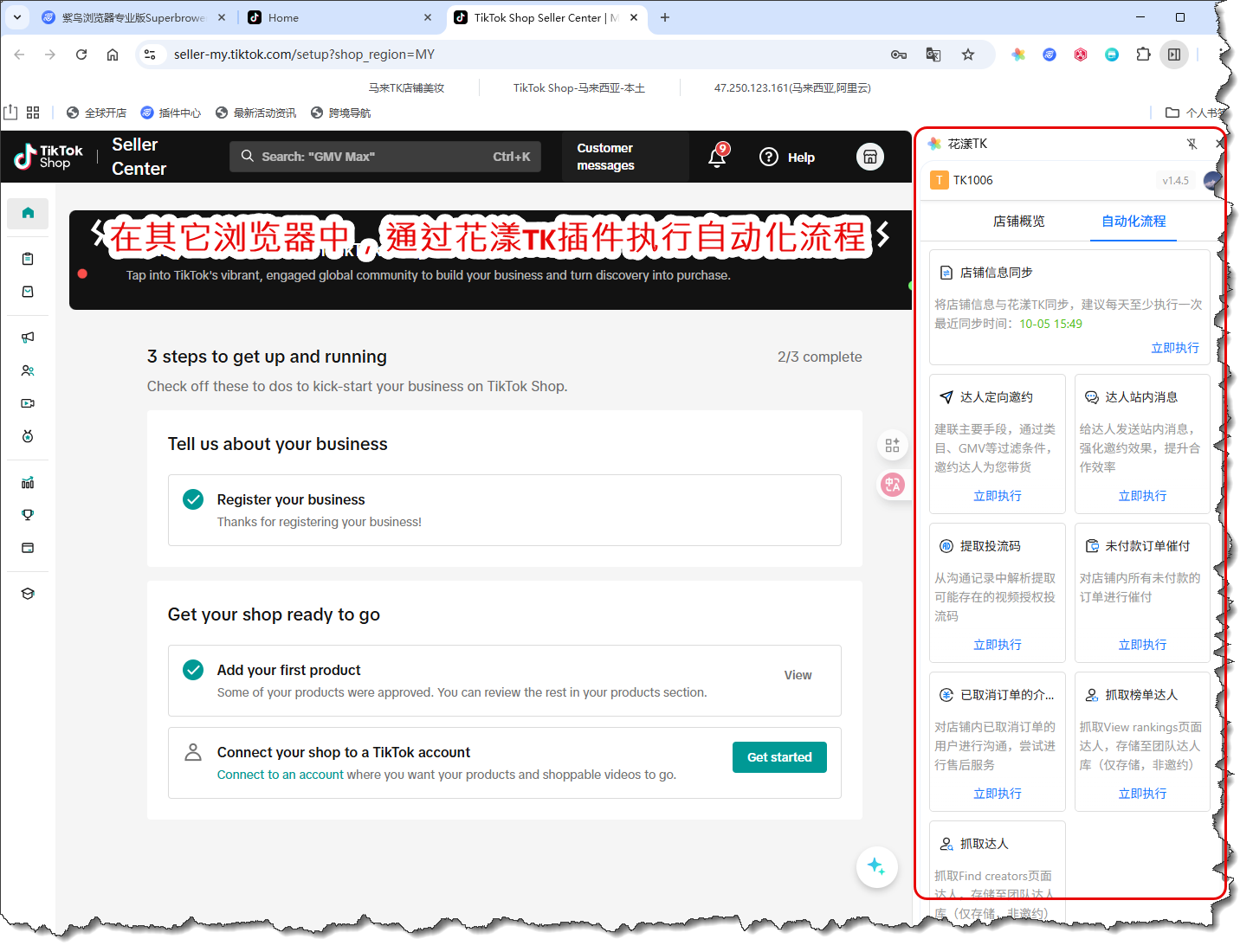 如果您用的是其它浏览器,请在打开浏览器后,打开花漾TK插件,选择您需要执行的流程,点击后即可执行。