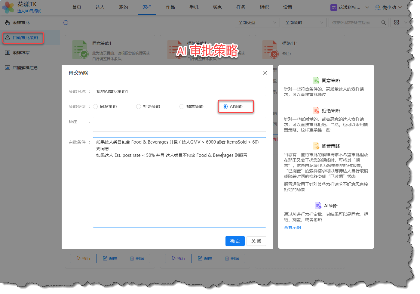 当我们编辑好自动审批策略后,便可以针对某个店铺的索样请求执行该策略,执行后的效果如下图所示: