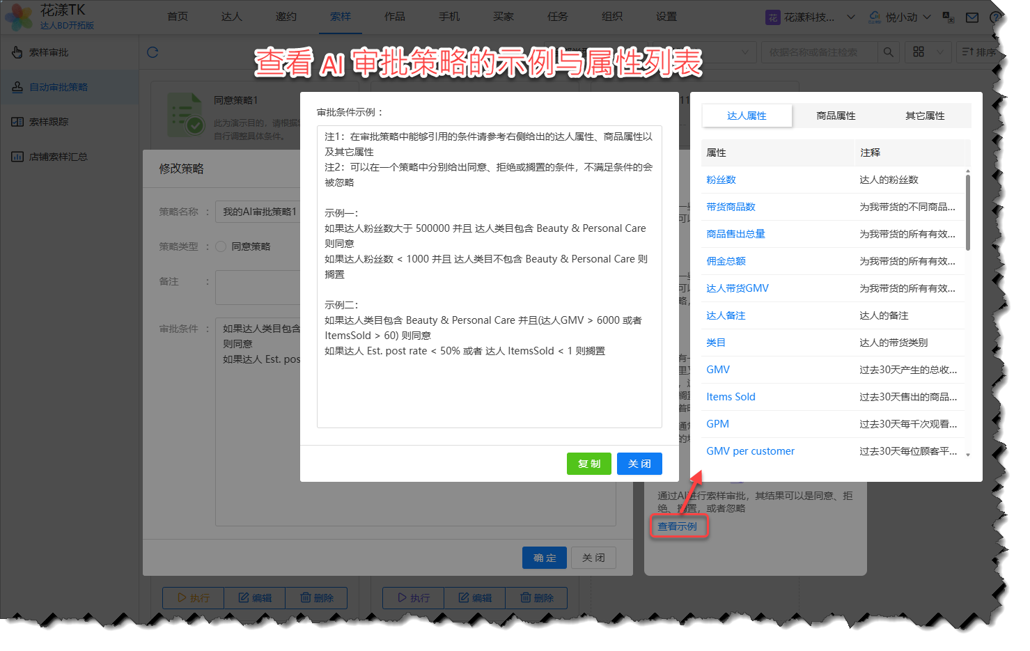 显然,我们需要知道的是:能够被 AI 所判断的属性都有哪些?此时,可以点击 “查看示例”,系统会列出能够被 AI 所识别并判断的所有属性,包括达人属性、索样样品(暨商品)属性,以及其它属性等: