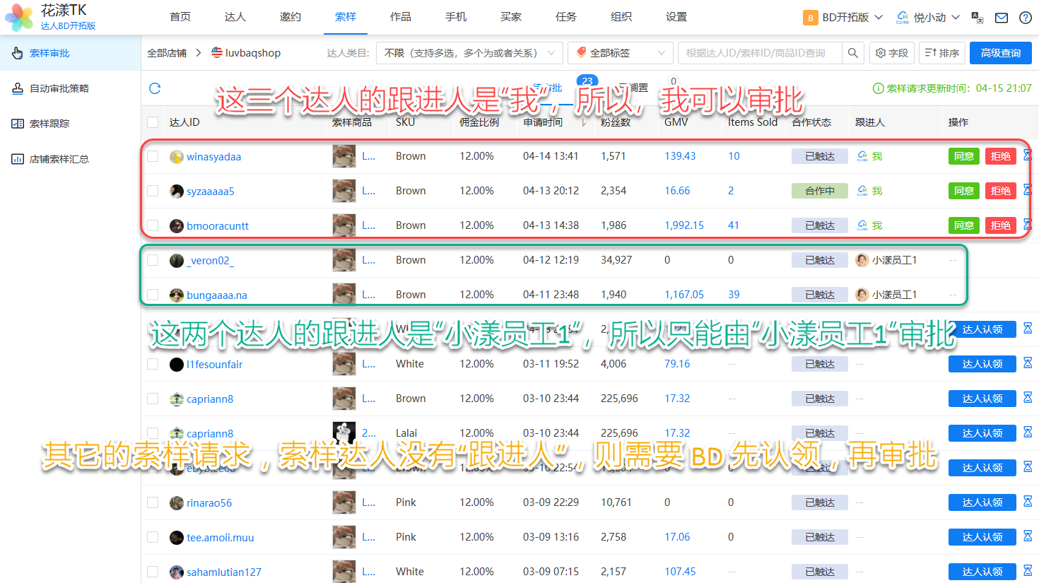 为了解决上述问题,花漾TK的解决方案是:如果开启了“索样审批的达人认领”,那么只有该索样达人的归属 BD 才能够进行样品审批,这样我们就可以实时查询到每位 BD 每天的样品发放情况。