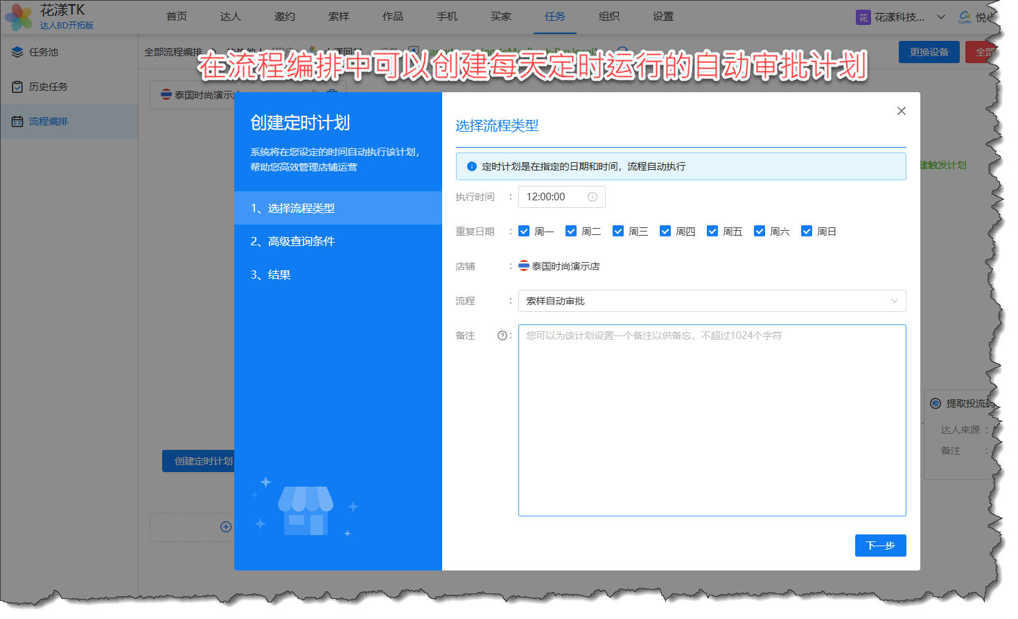 在流程编排中,可以创建一笔自动流程计划,每天定时自动执行索样审批策略。