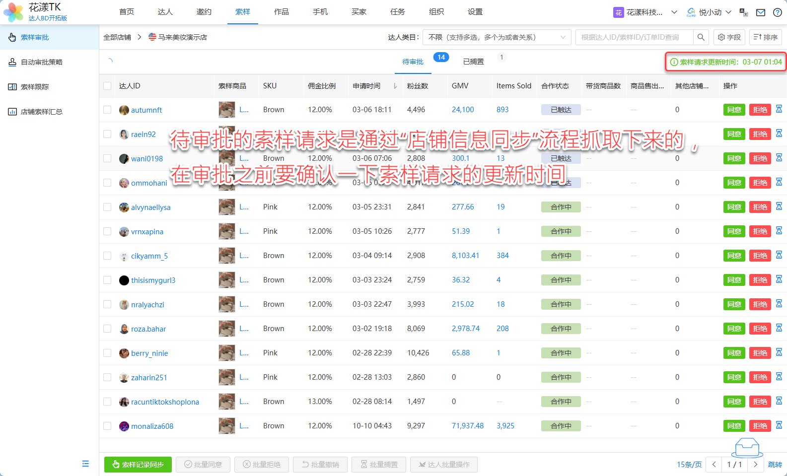 - 在店铺后台进行索样审批,观察到的达人信息是零散、片面的;但在花漾TK门户中能够观察到索样达人的完整信息,更有利于用户快速做出决策