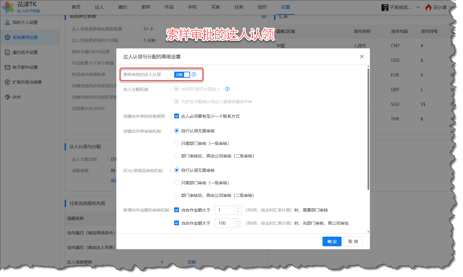 当您的团队专门设有 BD (暨商务拓展)岗位时,您可能希望将索样审批工作由达人专属的 BD 来完成,针对这种场景,您可以开启以下特性:索样审批的达人认领 。