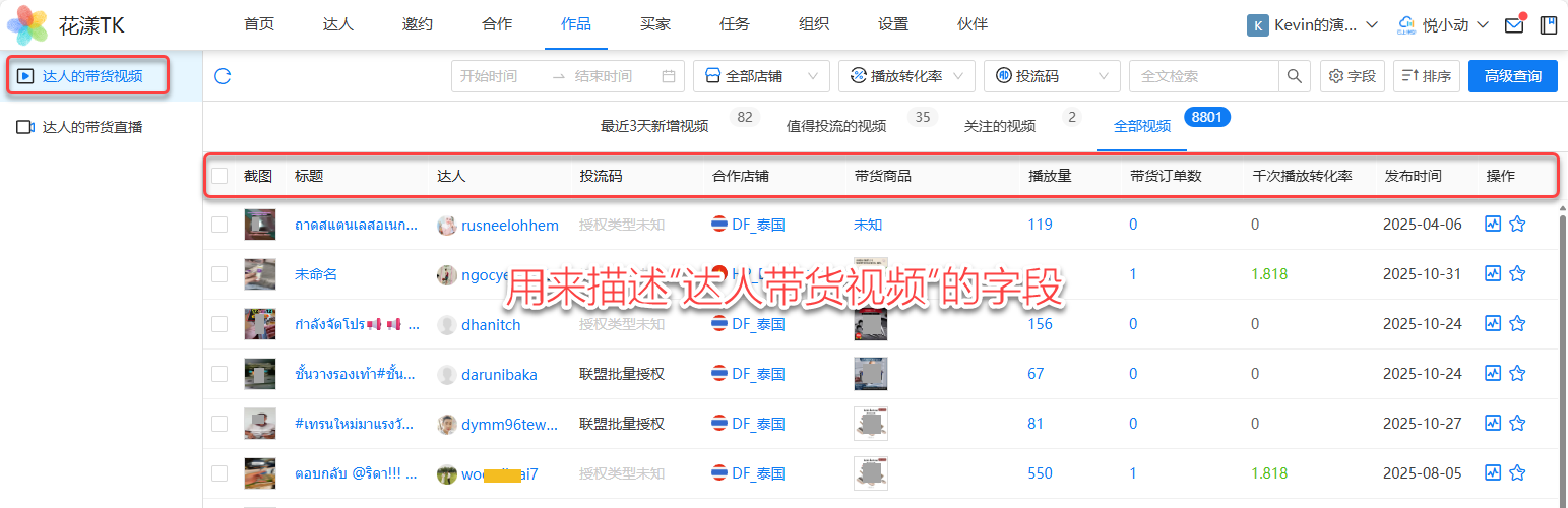 描述一个物体需要很多的属性,我们称之为“字段”。以“达人的带货视频”为例,我们会用到“标题”、“达人”、“播放量”、“发布时间”等字段来描述一条视频: