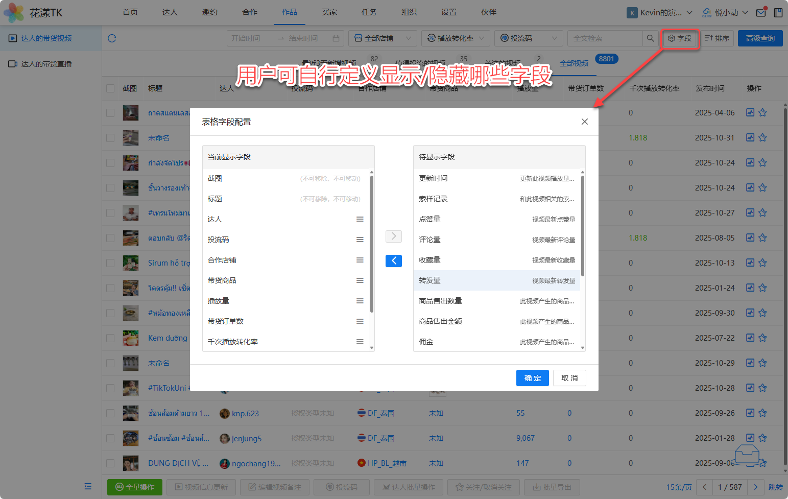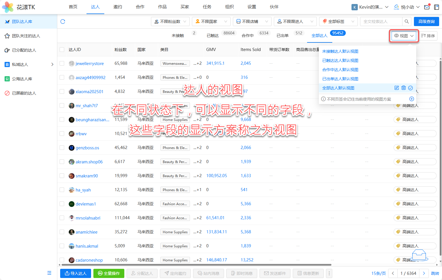 针对达人的字段展示,系统做的更加复杂一些。因为达人的属性实在太多了,特别是针对不同合作状态下的达人,用户希望看到的字段是不一样的。举例,针对“已触达”的达人,用户希望看到达人的“履约率”,但针对“已出单”的达人,用户希望看到达人的“带货订单数”。针对这类场景,花漾TK提出了“视图”的概念。所谓视图,就是不同字段的显示方案可以保存为一个视图,在不同的状态下,达人可以显示不同的视图方案。