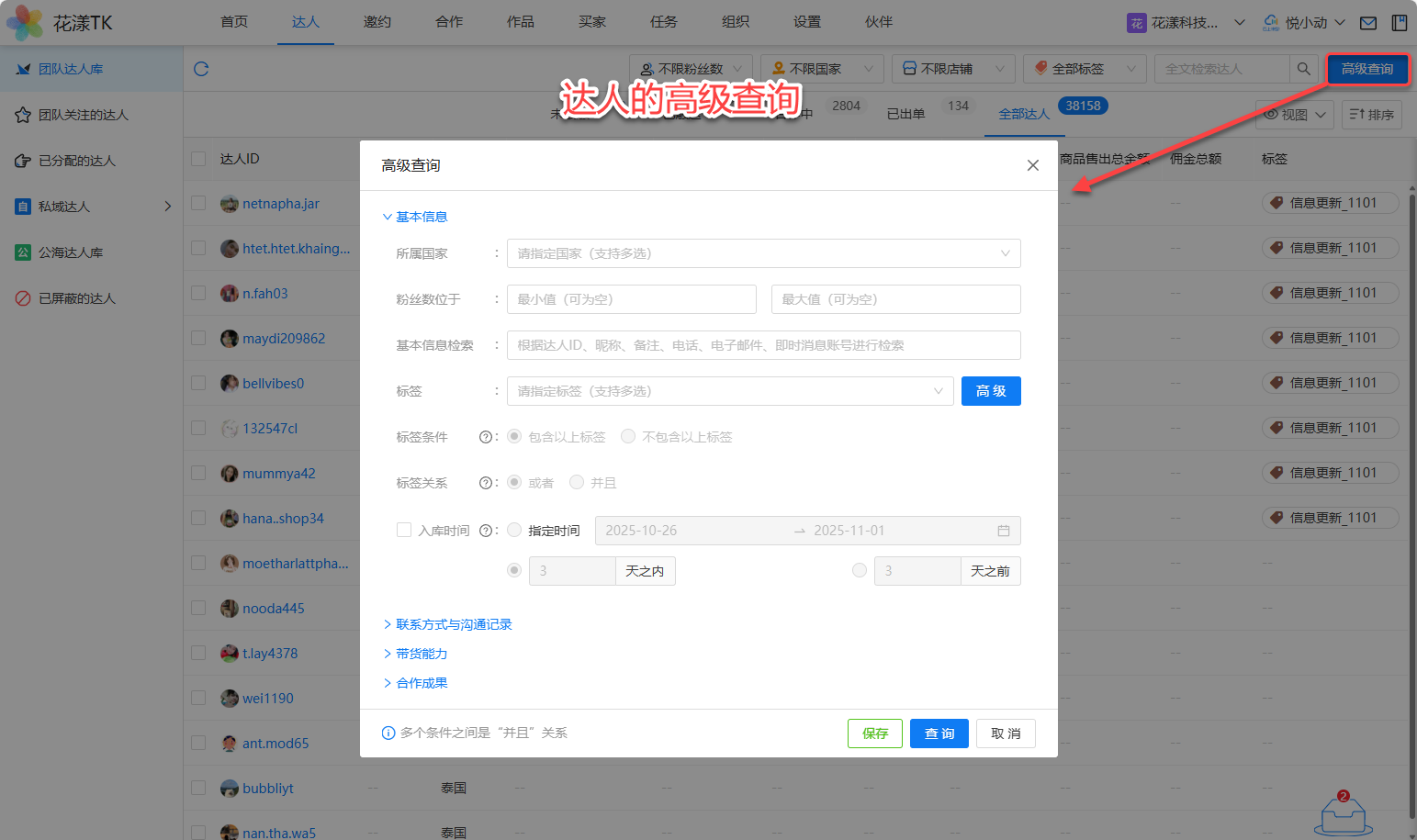 在花漾TK中,每一个业务对象都会提供“高级查询”,以达人为例,其高级查询如下图所示: