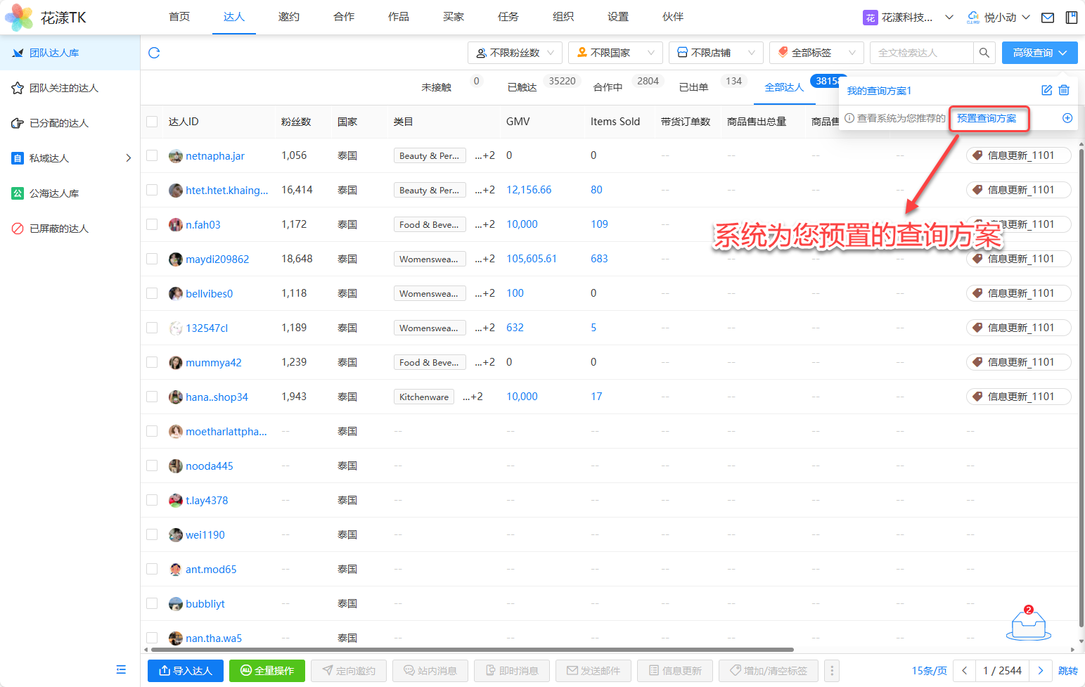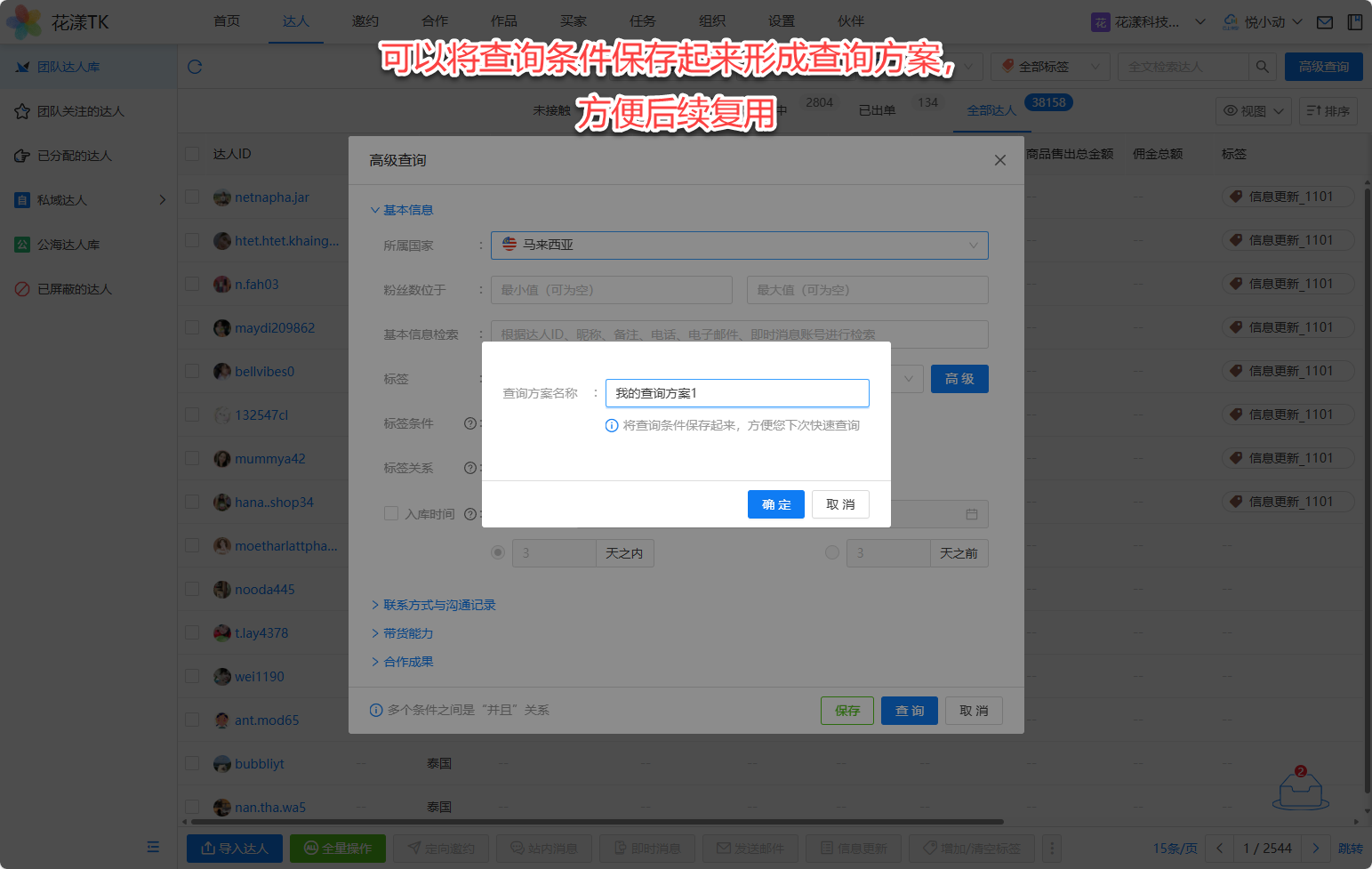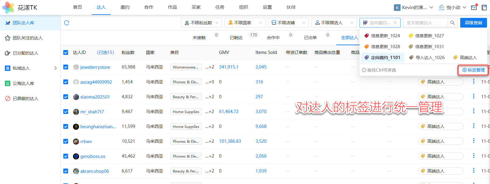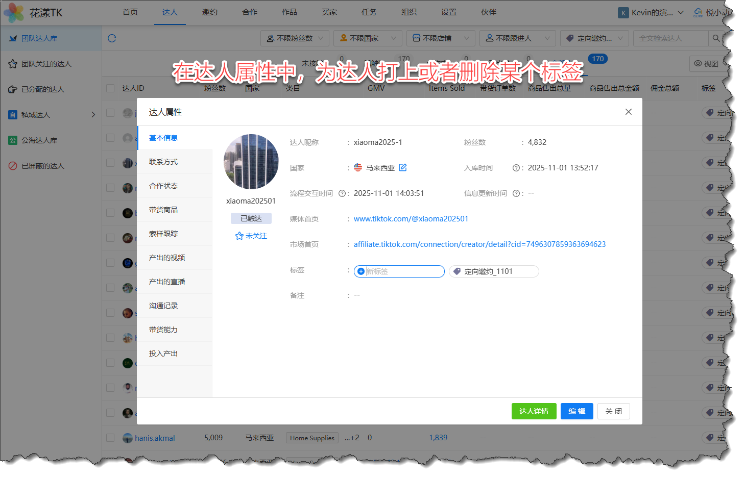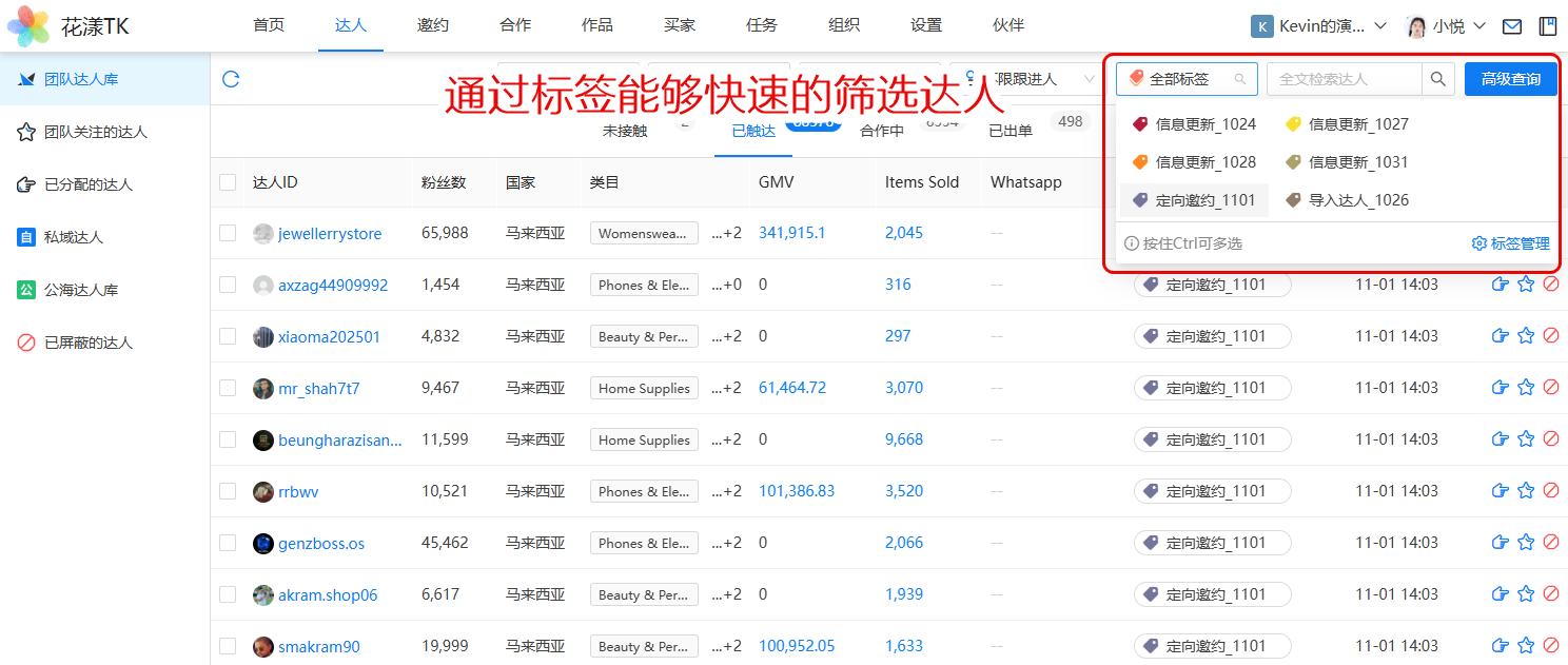 以定向邀约为例,当您邀约了若干个达人后,这些达人都会被存储到花漾TK门户中的“团队达人库”中,显然,您很想知道,如何快速的找出这些新邀约的达人。此时,可以用到“标签”这个特性。