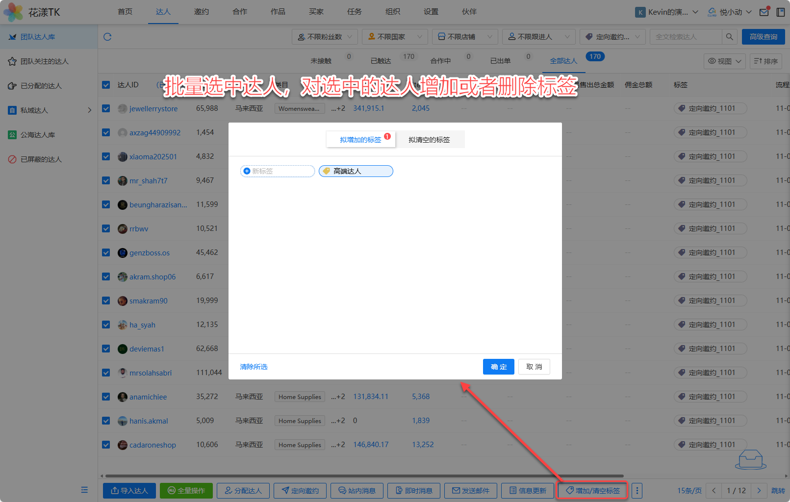 在达人列表页面,您可以选中多个达人,并对选中的达人批量打标签或者清理标签: