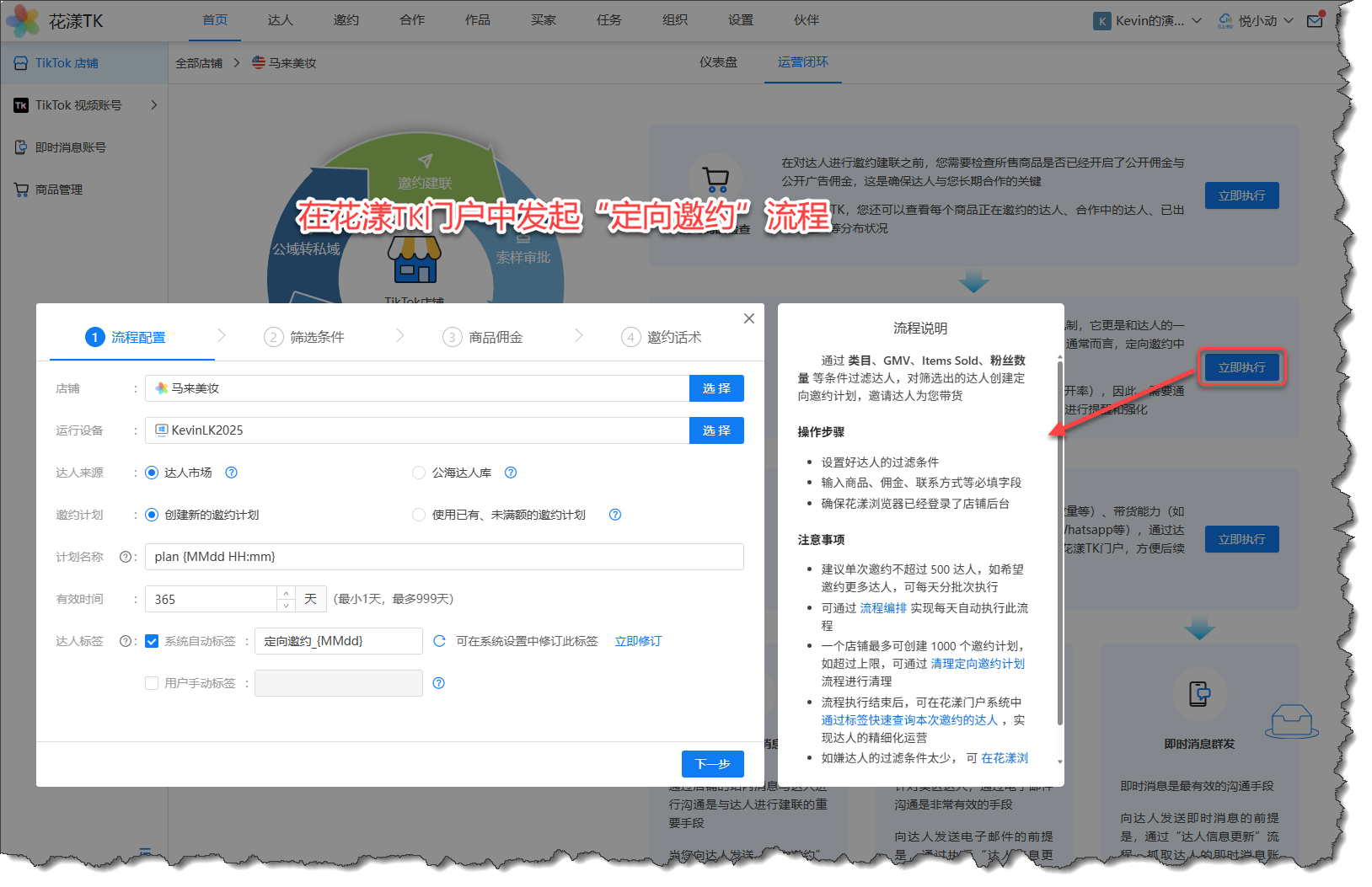 向达人发送 “定向邀约” (Target collaboration)是 TikTok 店铺的核心功能之一,本文向您介绍如何通过 花漾TK门户系统 快速、自动的创建定向邀约计划,通过本文的阅读,您将举一反三,逐步了解如何执行花漾为您准备的其它自动化流程。
