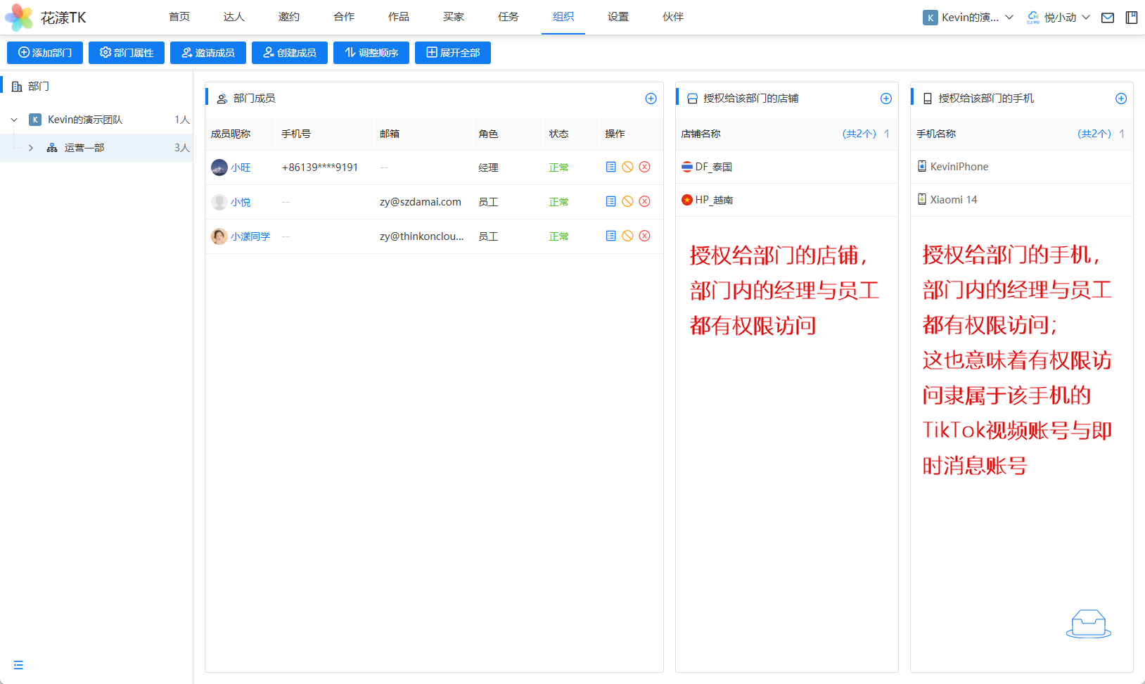 - 将手机授给某个部门,意味着该部门内的所有用户都拥有访问此手机的权限,由于手机账号(如 TikTok 视频账号、即时消息账号等)隶属于手机,因此,将手机授权给某个部门,本质上相当于将隶属于该手机的所有手机账号授权给了该部门